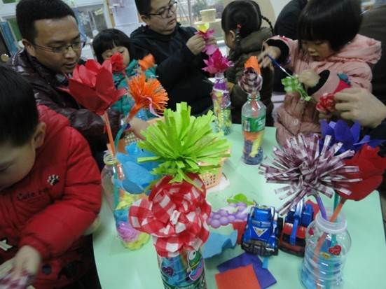 宝贝们稚嫩的小手配合着爸爸们笨拙的大手,专心地将五颜六色的折纸和各种材料慢慢地变成各式漂亮的花束和花瓶。礼物完成了,毫不知情的妈妈们来到教室,宝贝和爸爸齐齐为自己最爱的人送上这份满含着爱的礼物,爸爸妈妈的眼眶里不约而同地泛起了爱的泪光。