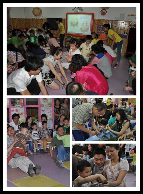 端午节是中华名族的传统节日,为了让宝宝们了解节日的来历和习俗,体验中国传统节日特有的韵味和过节的快乐,乐山市实验幼儿园贝贝一班近日邀请家长一起在教室里开展了“端午粽飘香”亲子活动。活动在宝宝们表演的儿歌《端午节》中拉开帷幕。通过观看端午节来历的视频,分享爸爸妈妈为宝宝们准备的“端午节好吃的”“端午节好玩的”“端午节挂的”图片资料,让宝宝们知道了关于对端午节的许多知识。接着,好玩的游戏“运粽子”开始了,宝宝们在爸爸妈妈做的障碍中勇敢前进,运输粽子。游戏“划龙船”,爸爸妈妈们用身体做成“龙船”,载着心爱的宝贝奋勇前进,永争第一。快乐,亲情在游戏中飘荡。接下来的环节“包粽子”比赛更把活动推向了高潮,全班共分了八个小组,每个小组一个会包粽子的家长当组长,大家在组长的带领下专心致志的包起了粽子,宝宝们帮忙拿叶子,舀米,忙的不亦乐乎。家长们也不甘示弱,不会包的也在积极尝试。不久,王睿捷宝宝外婆带领的小组征得了第一名,接下来,第二名产生了,第三名产生了……当大家都包完了粽子,老师和热心的家长们又马上把准备好的熟粽子端给大家分享,大家在“让爱住我家”的音乐中分享粽子,快乐交流,教室里洋溢着过节的喜庆,每个人都能感受到家一样的温馨氛围。活动在一片笑声中结束,每个家庭都把自己包的装满了甜蜜的粽子带回家与家人分享。我们分享的,不仅仅是粽子,更是快乐……