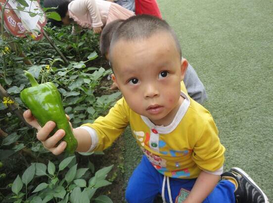 绿绿的菜地里,辣椒沉甸甸的挂在树上。2个月前,经过家长和小朋友们的栽苗、施肥、浇水,今天终于到了收获的时候了,小朋友们兴奋不已,因为这些都是通过大家努力劳动的结果。你们看,小朋友们正专心的采摘自己的劳动果实,分享着劳动带来的快乐。