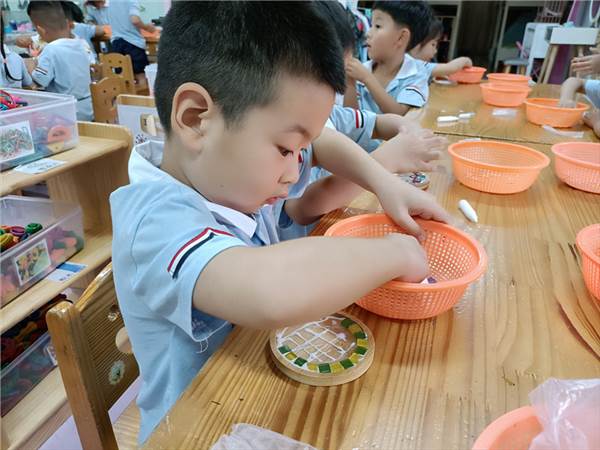 仔细、专注,孩子们小心翼翼的将填缝剂涂抹到杯垫上。