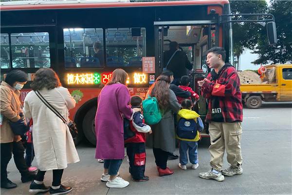 放学时间段,体育老师在公交站台引导幼儿及家长遵守公共秩序,注意排队,不大声喧哗,依次上车。