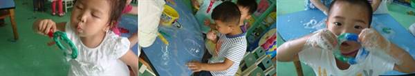 玩泡泡,是孩子们特别爱玩的一项游戏。今天,小三班的宝贝们就在老师的带领下为玩起了泡泡。活动中,孩子们尝试用餐具洗洁精、洗衣粉、肥皂等调配出泡泡水,再用随处可及的玩具拼插出吹泡泡的工具。瞧,孩子们制作出了正方形的、三角形的、椭圆形等各式各样的工具,孩子们玩的多高兴啊!