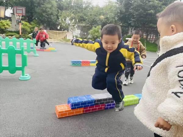 这是我们在积木区找到的纸砖,把它拼成长长的砖头,可以像马里奥叔叔一样跳过去。
