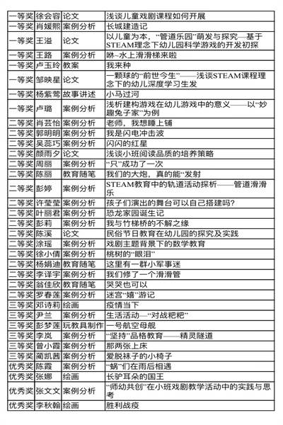 参评内容主要为教育随笔、观察记录、案例分析、论文等,评选结果于近日进行了公示。乐山市实验幼儿园荣获“先进单位奖”,其中一等奖8人,二等奖17人,三等奖6人,优秀奖4人。
