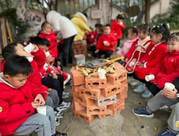 一切准备就绪,煮茶炭火升起,茶香四溢,软糯的红薯,香甜的板栗,各种烤物的香味在幼儿园飘荡,实现了孩子们在幼儿园吃团圆饭的美好愿景。