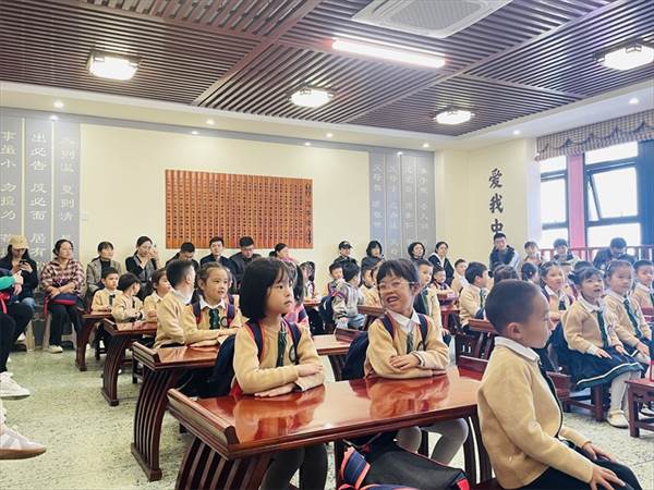 小学老师带我们参观了茶艺室、古琴室、舞蹈室、厨艺室、钢琴室等功能室。还组织我们体验了小学生的课堂,端坐的孩子们在课堂上积极踊跃的举手发言,俨然一副小学生模样。