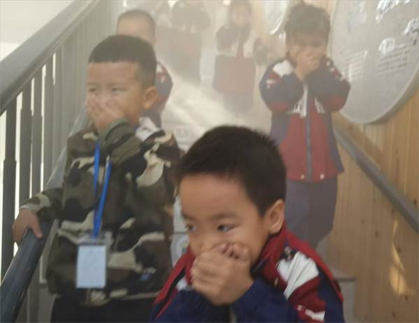 在老师们的指挥下孩子们弯着腰用湿毛巾捂住口鼻沿着指定楼梯口快速前进到达各班预定撤离点