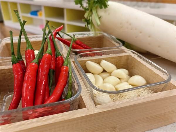 首先,我们精心挑选了新鲜的萝卜、食盐、白糖、陈醋、辣椒、大蒜等材料,确保每一种食材都是安全、健康的。此外,我们还精心布置了活动场地,确保每个孩子都有足够的空间进行操作。孩子们对这次特殊的“烹饪课”充满了期待,纷纷表现出浓厚的兴趣和兴奋的心情,他们的眼神中充满了好奇和憧憬。
