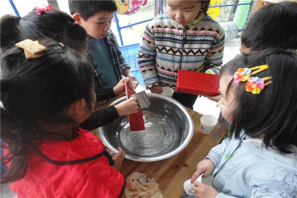 孩子们很快找到了哪种屋顶排水快的答案,并用实验验证了自己的猜测。接下来,孩子们开始纷纷动脑动手寻找让平的屋顶加快排水的方法。最后通过观察图片理解平房顶和三角形房顶所在的地域位子,找到了屋顶的秘密与我国南北地区的气候影响有关。屋顶,本是一个与我们生活息息相关的东西,我们却忽视了它带来的最本土化的信息。相信,这一活动能让孩子找到更多的学习契机。