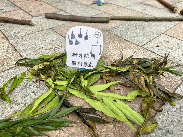起初双双兄弟在草坪的石头上勾勒出整齐的棋格,他们还捡来不同形状的树枝、叶片当作棋子,一场简易又有趣的户外对弈就此展开。