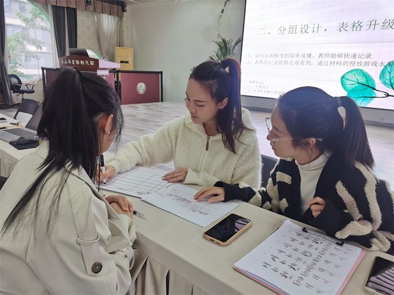 3.0阶段的教研迈入深度研磨期,老师们创新开启“结对观摩+视频分享+现场点评+表格共创”多元研讨模式。各班两两结对进班观摩,以第三方视角精准给出材料投放优化建议;教研会上,大家借助游戏视频,分享班级游戏亮点与推进进程,坦诚抛出各类材料适配难题。各班分享结束后,老师们即时互评支招、给出具体调整方案,研讨尾声还分组共创材料清单表格,结合日常用表习惯,明确材料投放实用性及对应幼儿能力发展支撑点,让材料管理更具科学性。领导现场点评总结,进一步指明幼儿自主探索材料的教研新方向,让材料更贴合孩子游戏探索天性。