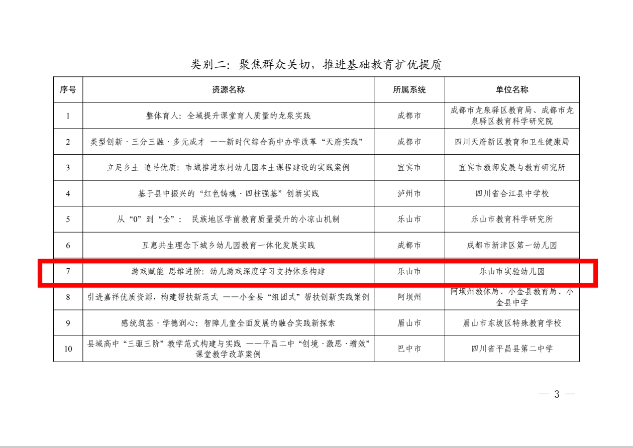 日前,四川省教育厅组织开展了 2025 年四川省基础教育创新实践案例征集推荐工作,经组织报送、专家评审,共评选出 10 个类别 100 个创新实践案例。 乐山市实验幼儿园报送案例《游戏赋能 思维进阶:幼儿游戏深度学习支持体系构建》成功入选,成为乐山市唯一入选的幼儿园实践案例,展现了我园在儿童游戏与思维发展方面的积极探索与实践成果。 一、教育积淀 百年传承 乐山市实验幼儿园创办于1928年(初名“进德幼稚园”),1986年更为现名,作为乐山市教育局直属省级示范幼儿园,曾获“全国巾帼文明岗”、“四川省教育工作先进集体”等多项荣誉。 我园始终秉持区域学前教育创新与引领的使命,着力打造以游戏为载体的深度学习高质量育人目标和教育样态。在 “3S”思想母体引领下,形成“遵本循真,培‘主’育‘生’办园理念,深耕园本课程深化改革,最终指向培养未来的儿童。 二、创新实践 思维进阶 本案例源于区域学前教育游戏改革实践,聚焦“以游戏为基本活动”的育人理念,针对幼儿游戏中普遍存在的“学习浅表化、教师支架缺位、园所生态封闭、家园对话消隐”等现实困境,历经八年系统性的行动研究,构建了以“幼儿深度学习”为核心的游戏改革实践体系。通过“样态识别—环境创生—协同共育—生态重构”四阶模型,形成了支持幼儿深度学习的园本课程体系、教师支持机制与家园协同生态,实现了从“游戏行为观察”到“学习意义建构”的系统转化与范式创新。 三、日常践行 走向高质 荣誉的背后,是市实幼幼教集团全体教职工日复一日践行理念,打造优质教育生态的实践成果。从“课程建设、环境打造、师幼互动、家园协同”四维落地支持幼儿深度学习。 我们基于“3S”教育思想母体作为引力核心,形成“一体五翼”集团化架构,构成“‘3S’课程、双‘享’课程、‘星’生长课程、康·美课程、未来力课程”的五大特色园本课程体系,驱动我市学前教育迈向优质均衡新阶段。 我们主张“把环境还给幼儿”,让每一处环境都成为可对话、可探索的“第三位老师”,促进幼儿有意义建构的学习,从而持续推动幼儿的多元能力发展。 我们致力于打造“学习型、实践型、研究型、创新型”教师团队。通过专题教研、案例研讨、工作坊等形式,持续提升教师支持幼儿游戏深度学习的能力。 我们系统构建了“家园共构”支持体系,通过设立家长学校、园级家委会等常设组织架构,并持续开展一对一家长沟通、家长开放日、专题育儿沙龙,从园级到班级多层次互动活动。引导家长理解游戏在幼儿学习与发展中的关键价值,从而共同构建起支持幼儿思维发展的协同教育共同体。 四、持续探索 照亮未来 这份省级荣誉,既是肯定,更是新的起点。乐山市实验幼儿园将继续深耕游戏与深度学习的研究,不断完善支持体系,让每个孩子都能在“爱与自由”的阳光下,通过游戏这扇窗,看到更广阔的世界,建构更深刻的思维。 未来,我们将继续践行“遵本循真,培‘主’育‘生’”办园理念,让每一颗童心在游戏的沃土中,绽放出独特而灿烂的思维之花。