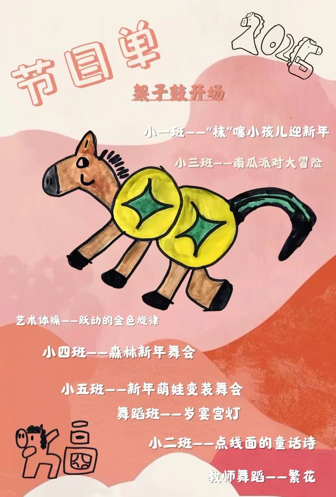 中大班组节目单—:架子鼓开场中三班--小泥巴变形计中一班--阿诗的大花布舞蹈班--岁宴宫灯大一班成长。新年新程中二班解不开的线团中四班-小水滴的新年旅行艺术体操跃动的金色旋律大三班--爷爷的纸,时光的诗大二班--堆堆博物馆教师舞蹈-繁花