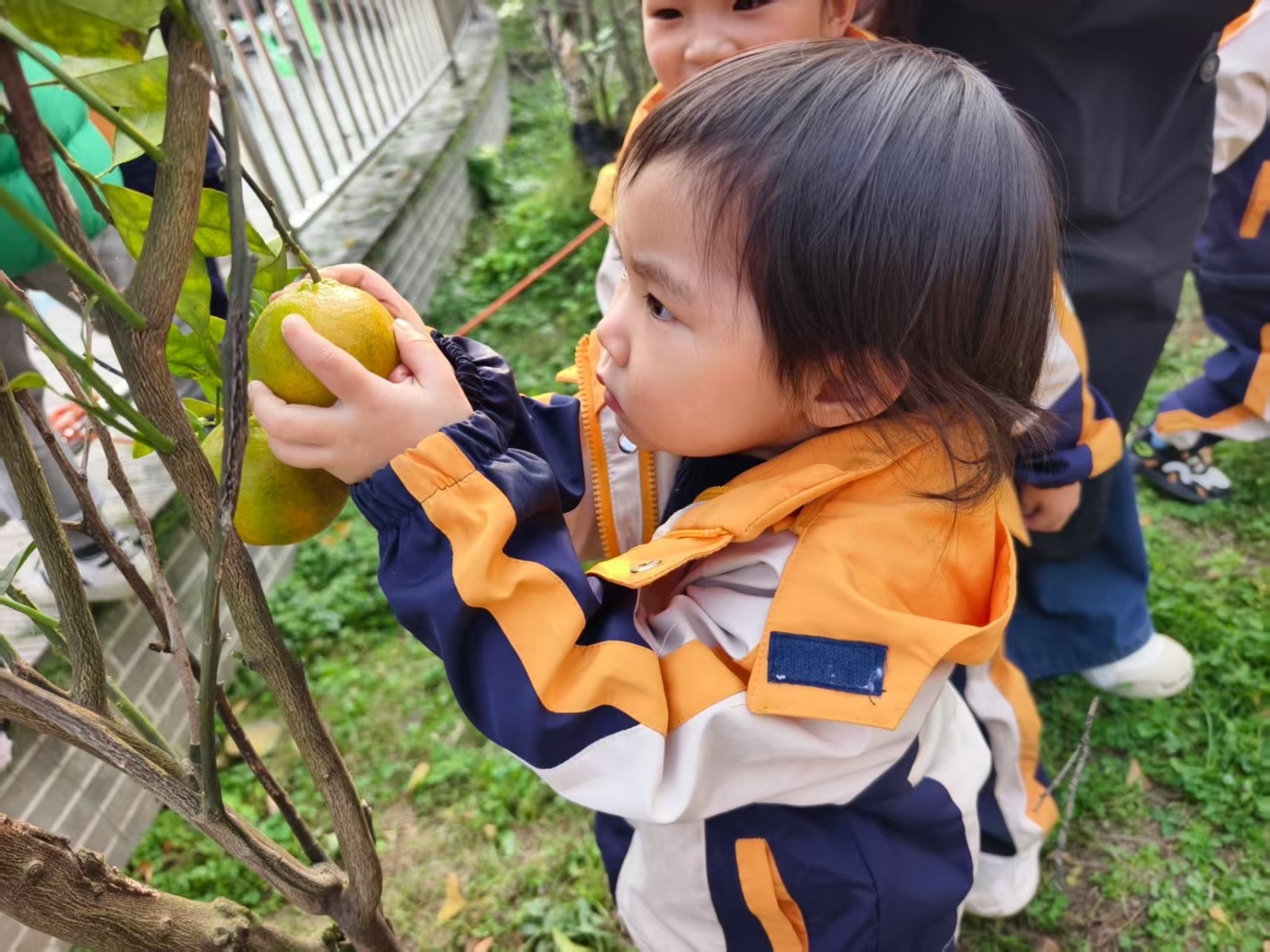 小朋友踮着脚尖去摘橘子,