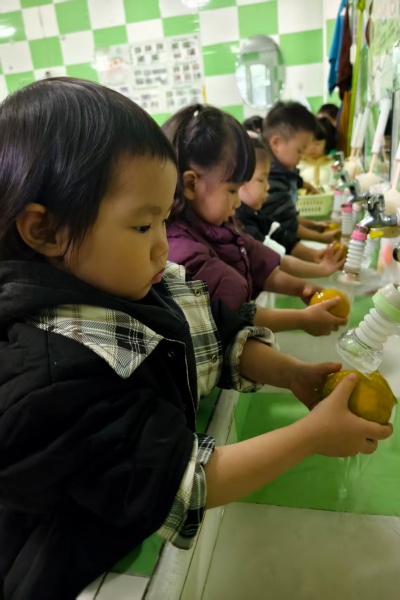 孩子们小手捧着橘子轻轻搓洗,