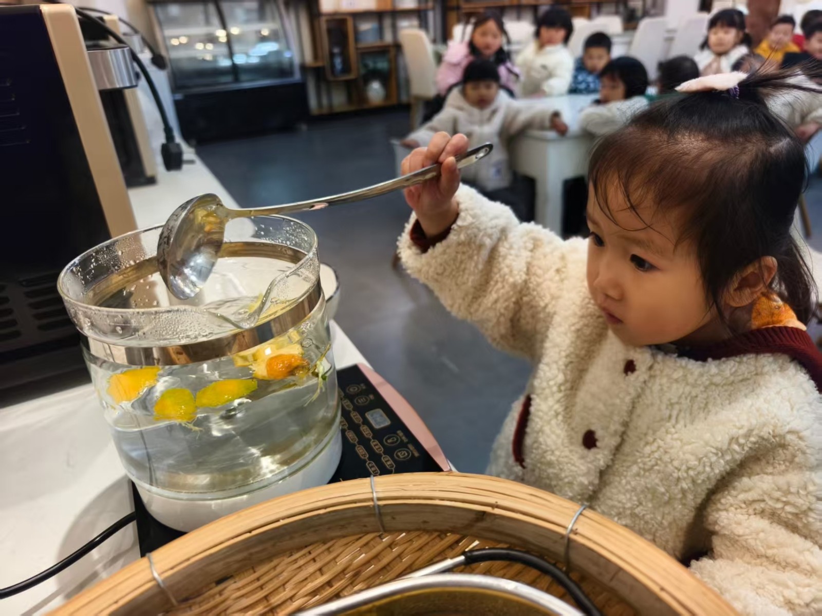 老师将熬好的橘皮水分给孩子们,