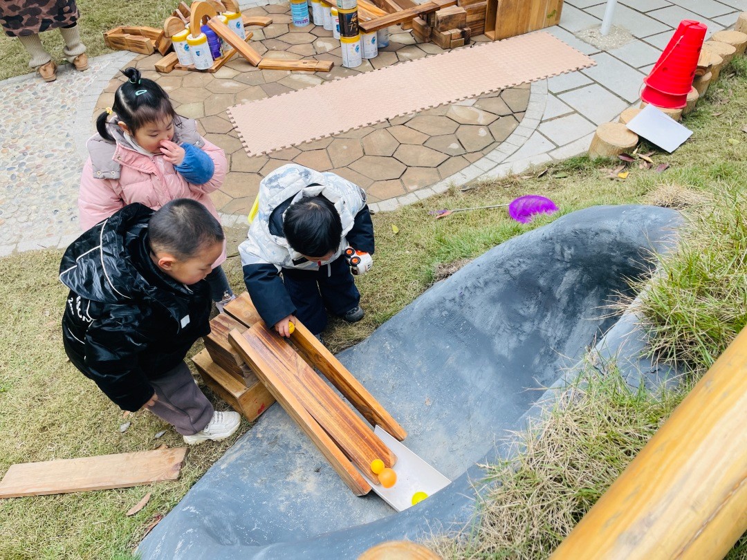 孩子们将PVC管与木板拼接成滑道,延伸至隧道深处。他们反复调整管道角度,让小球在幽暗的隧道里顺畅滑行,还不忘用渔网在隧道出口“捕捉”滚落的小球,将轨道游戏变成了一场刺激的“隧道大冒险”。在这个过程中,孩子们探索物体重量与速度的关系,物体速度与轨道高度关系。