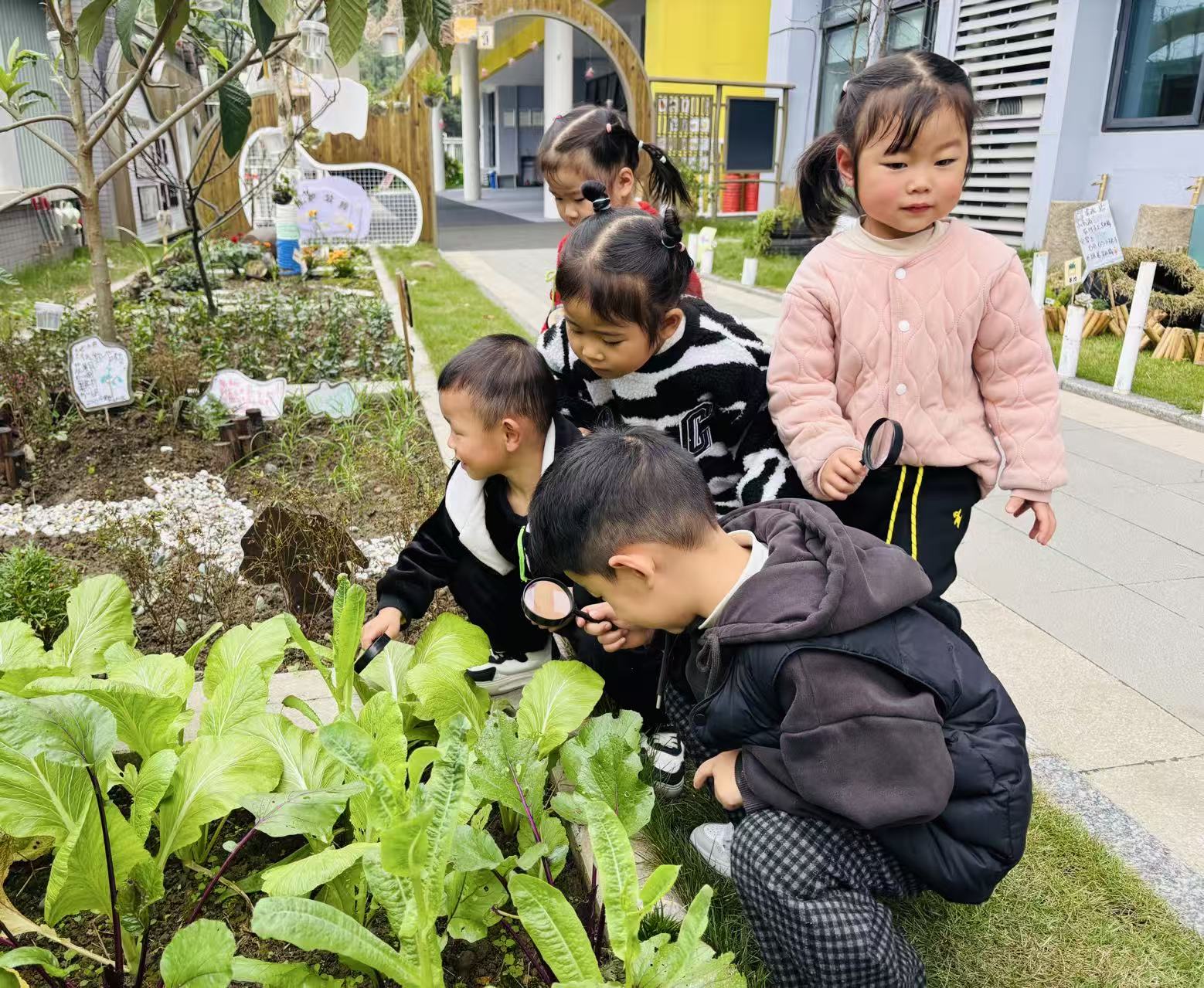 口袋里的秋天,藏着南瓜的秘密 至乐分园胡静 幼儿喜欢在大自然中发现、探索,一花一草、一树一木,都对孩子们有着巨大的吸引力。本学期,乐山高新区实验幼儿园至乐分园的孩子们对“南瓜”产生了浓厚的兴趣。他们与南瓜的相遇,充满了天马行空的想象与挑战。 金秋九月,一场关于“把秋天装进口袋里”的户外收集活动后,孩子们开展“口袋宝藏分享会”,佳钰带来的橙黄南瓜勾起大家对南瓜的兴趣。一周后,孩子们带来了圆滚滚、小巧、长条形、带绿纹等各式各样的南瓜,就此开启南瓜的探索之旅。 小小的南瓜,大大的好奇。宝贝们俯身拿起放大镜探索,和小伙伴一起深入南瓜的内部世界。摸摸圆圆的南瓜,看看黄黄的瓜纹,闻闻甜甜的瓜香,小小的我们,探索大大的南瓜世界~ 看着杂乱的分类现场,老师抛出问题:“除了按照南瓜的形状分类,还可以怎么分呢?”孩子们两两合作,自发地将南瓜按从大到小的顺序排成一排,像搭起了一座“南瓜塔”。孩子们通过亲手触摸、直观比对,清晰感知了“大”“小”的相对概念,学会了用简单语言描述南瓜的大小特征。 为丰富孩子们对南瓜的认知,教室里投放了绘本《胖墩墩的南瓜》,体验情景表演游戏《南瓜汤》,进一步激发幼儿对南瓜的兴趣,期待后续的南瓜探秘游戏。 这些可爱的小猜想,让宝贝们迫不及待地想打开南瓜,去一探究竟啦!在孩子们的期待中,我们开展“南瓜大解剖”活动。 孩子们轮流触摸、观察,证实了小旸的猜想——南瓜肉是金黄色的,摸起来软软糯糯;籽儿扁扁带尖,裹在黏糊糊的瓜瓤里。他们把发现画下来后,又对南瓜籽产生了计数兴趣。 通过分工合作,孩子们巩固了点数技能,还学会按照分类计数,并开始尝试用南瓜籽种植,开启了南瓜籽的种植实验。 孩子们挖瓜瓤遇黏液难题,柯瑞巧用勺子刮籽防粘手,思礼发现清水能溶解黏液让南瓜籽变干净,孩子们纷纷模仿,用清水搓洗后干净的南瓜籽就浮起来了。 孩子们种植南瓜籽时发现有的地方浇了很多水,有的地方没有浇到水。老师组织孩子们及时回顾,了解种子发芽的条件,约定做好标记、每周按时进行观察。 一周后南瓜籽未发芽甚至腐烂,孩子们分析出浇水不当、频繁挖土等原因,通过沉浮筛选出饱满籽儿并开展科学小实验。幼儿在操作中萌生大小认知、点数、筛种等探究点,也让数学技能在解决数籽、选籽等问题中灵活运用。 这段南瓜相伴的时光,如饱满种子埋在心底,让他们在自主探究中收获了真切的成长与温暖。