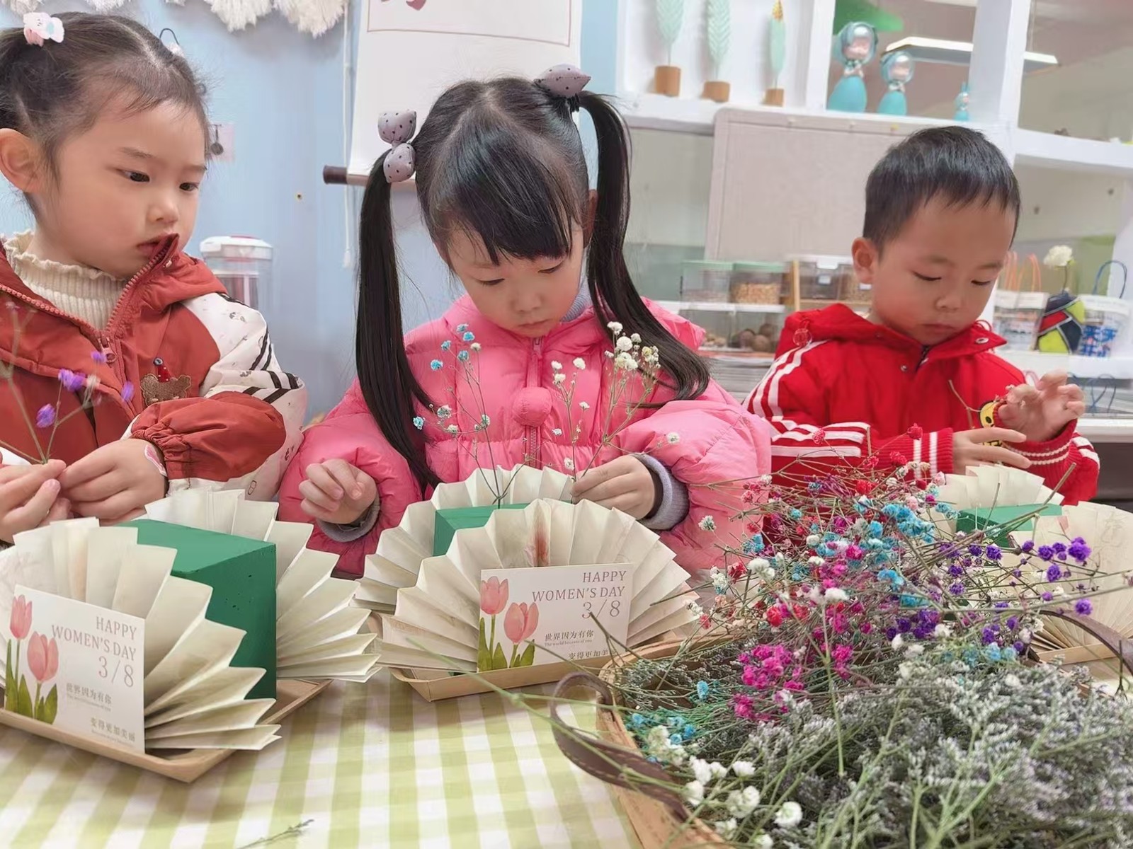 久顺分园:女神手机链、扭扭棒花束、女神项链、把爱装进包包里、拓印女神花束。