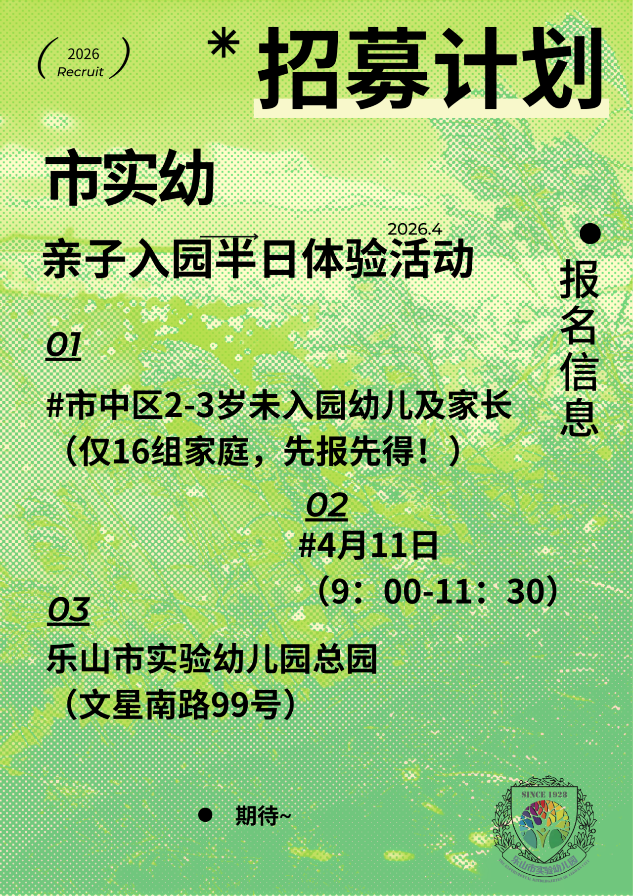 在这个草长莺飞的四月天,乐山市实验幼儿园向社区2-3岁幼儿家庭发出诚挚邀请:牵起宝贝的手,走进这所充满欢笑与探索的乐园,用半日时光,见证孩子无限生长的可能。