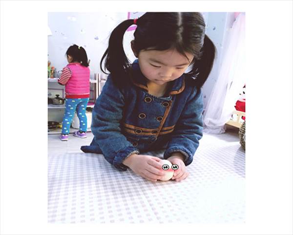 区域游戏时间,杉杉在家庭区里煎鸡蛋,一会儿后她又拿起了一颗鸡蛋,说:我要煮蛋。蛋煮好后,杉杉把蛋拿出来放在桌上准备去请小朋友们来吃,可是她发现鸡蛋放不稳,她反复尝试了几次后, 鸡蛋还是要滚落,怎么办呢?这时她大声呼喊:老师,快来帮帮我!老师探明究竟后也开始学杉杉用手立鸡蛋,然后老师故意大声说:怎么立不起呢?这时在一旁搭公路的小朋友被吸引了过来......