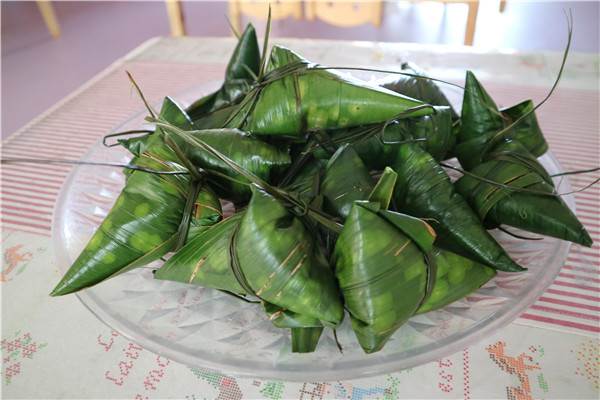 热心妈妈们手把手,耐心、细致地挨个指导着孩子们如何用粽叶卷成尖筒,往尖筒里填满糯米、红豆,把食材压压紧,盖上粽叶,团成一团,最后用绳子牢牢地拴紧、拴结实。一个个胖乎乎、绿油油,带着几分拙朴,带着几许清香的粽子在孩子们努力翻飞的小手中诞生了......