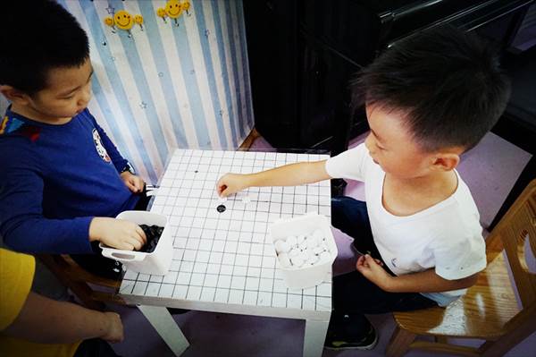两名小棋手技术都还不赖,白棋一方对黑棋紧追不放,想把黑棋的道路牢牢堵住,黑棋一方沉着应战,机智的躲着白棋的围追堵截。机会来了,四颗黑棋连成一线,而首尾均无白棋,此局黑棋方获胜。