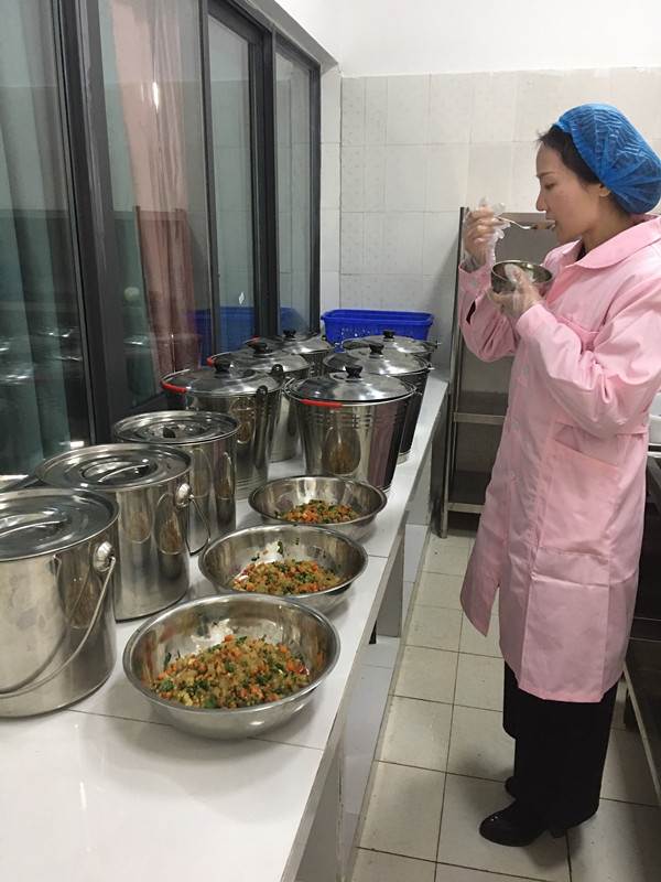 保健老师寇老师坚持每日在幼儿餐前试餐,保证幼儿餐点营养、卫生: