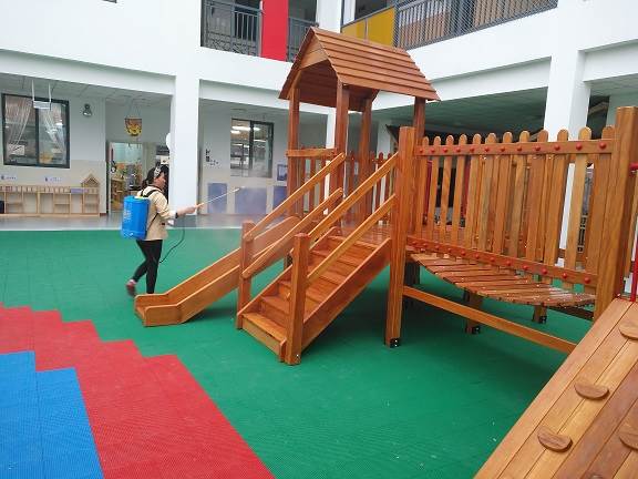 二、加强消毒工作。班级放学后用紫外线消毒灯对教室的空气和表面的物品进行消毒处理,每周消毒2~3次;幼儿饮水杯、餐盘、餐巾每日高温消毒两次;每日用消毒水拖地;幼儿就餐前有消毒毛巾擦拭桌面等。