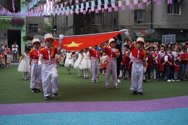 小小升旗手们早已准备完毕,庄严肃穆的等待国歌声的响起。全园孩子们目光炯炯,齐声共唱国歌,表达着心中那份对祖国稚嫩的热爱!