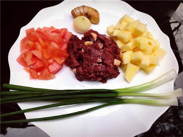 1、鲜鸭脯肉切丁,土豆,西红柿切丁待用,姜蒜切片,葱切花。