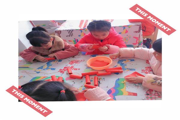 红红的纸通过孩子们的巧手,卷一卷,粘一粘,串在绳子上,一串串年味十足的鞭炮做好了。
