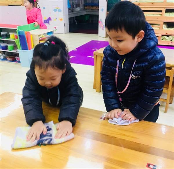 我们一起扫地、拖地。餐点前擦桌子和摆盘子。