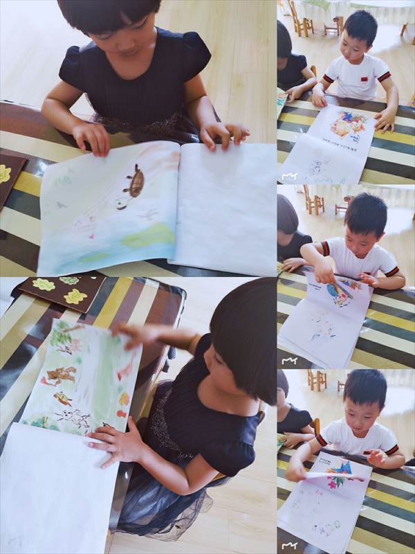 每天在吃过水果和点心孩子们都可以自由的去拿自己制作的书来看和小伙伴们一起分享,也可以交换看,大家看的好开心啊!