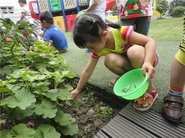 “等一下,老师你看,我们的蔬菜地里的小草又长高了,它会吸收蔬菜宝宝的营养的,我们要不要先帮他们把杂草除干净再去采摘?”“好吧,那我们现在就行动起来帮我们的菜园打扫除一下吧。”