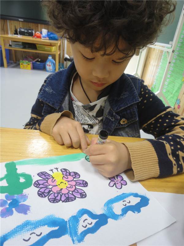 最近我发现我们班的孩子对手指产生了浓厚的兴趣,于是我们开始着手探究。慢慢的孩子发现:人与人之间有着许多不同点,就连看似相同的指纹,也不能找到完全相同的。在无意中孩子发现指纹很有趣,用笔稍添几笔,就能变成可爱的小脸。渐渐地喜欢“指印画”的孩子多起来,再加上他们指印时深浅不一, 层次鲜明。到了后期,他们发现除了能够简单地在纸上印下美丽的图案,甚至有些还能利用彩色笔画出的轮廓组合成花朵、孔雀、蝴蝶、小鸡、毛毛虫、蜜蜂等等更加有趣的动物植物,下面让我们一起来欣赏这些涂鸦艺术: