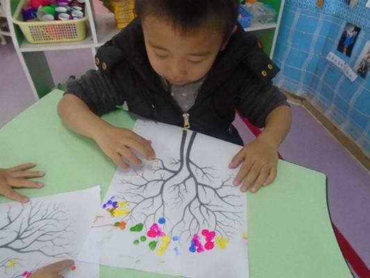 小五班开展了手指点画——彩虹树的美术教学活动。活动中,孩子们用自己小小的手指在颜料中轻轻一蘸,再在纸上一按,将大树装扮成了美丽的“彩虹树”。这次的活动,不仅很好的锻炼了孩子们的小肌肉和手指灵活性,也能让孩子们体验到绘画的无限乐趣,激发孩子们对美术活动的兴趣。