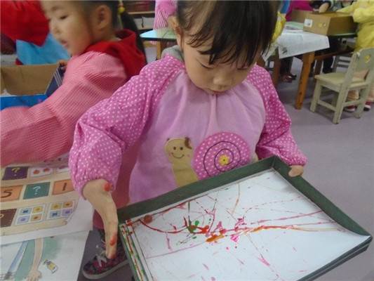 生活中充满了乐趣,生活中更是有无穷无尽可供孩子作画的工具,而小班的孩子正处于涂鸦期、表现期,他们好奇、好动、好模仿,还喜欢明亮的色彩。结合颜色蹦蹦跳的主题市实幼小五班的宝宝用弹珠蘸上颜料在盒盖上进行滚动,盒盖上出现了各种五彩斑斓有趣的线条,并让孩子们在玩中认识色彩感受到世界任何物品都可以无限的想象和创作。