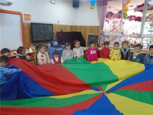 瞧,在乐山市实幼小五班,正开展着一系列趣味音乐活动,我们采用彩虹伞当“风”,纱巾当“翅膀”,拉拉彩球当“闪电”,运用各种材料让孩子来感受音乐。孩子们都很感兴趣,并且都踊跃参与。
