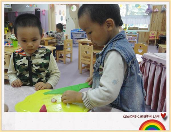 家庭区孩子们带着意图开展游戏,在游戏中分工合作,有的扮演厨师、有的扮演服务员、有的小朋友负责切菜、有的小朋友负责炒菜,每个人是那么的投入和专注。