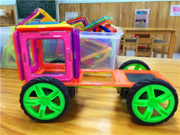 第二天晨间游戏时,你又选择了磁铁片,并重复着和昨天相同的玩法。你邀请我来观察你的游戏,并对我说:“陈老师,我妈妈昨天告诉我了,是因为有磁力车子才会动呢!”我担心“磁力”一词对你来说会不会太抽象,便试探性的问了问:“磁力是什么呀?”你说:“我在看猫和老鼠的时候,Tom就会用磁铁来抓Jerry,磁铁是有一根线的。幼儿园的磁铁片的线虽然看不见,但仍然可以拉动带铁的东西。”我惊讶于你竟然能将看动画片的间接经验转化为你的直接经验,知道磁铁能吸走带铁的东西并能清楚的表达出来。小航,你真是一个有能力的学习者。 你说:“我还想将这辆货车升级。”于是你用更多的正方形磁力片搭出了货车厢,在货车的尾部又加了一个铲子,你说这样货车两头都可以推雪了。你还选择了一些三角形磁铁片搭在了货车顶,你说这样就变成“直升货车”了,我不得不为你天马行空的想象表示赞赏。