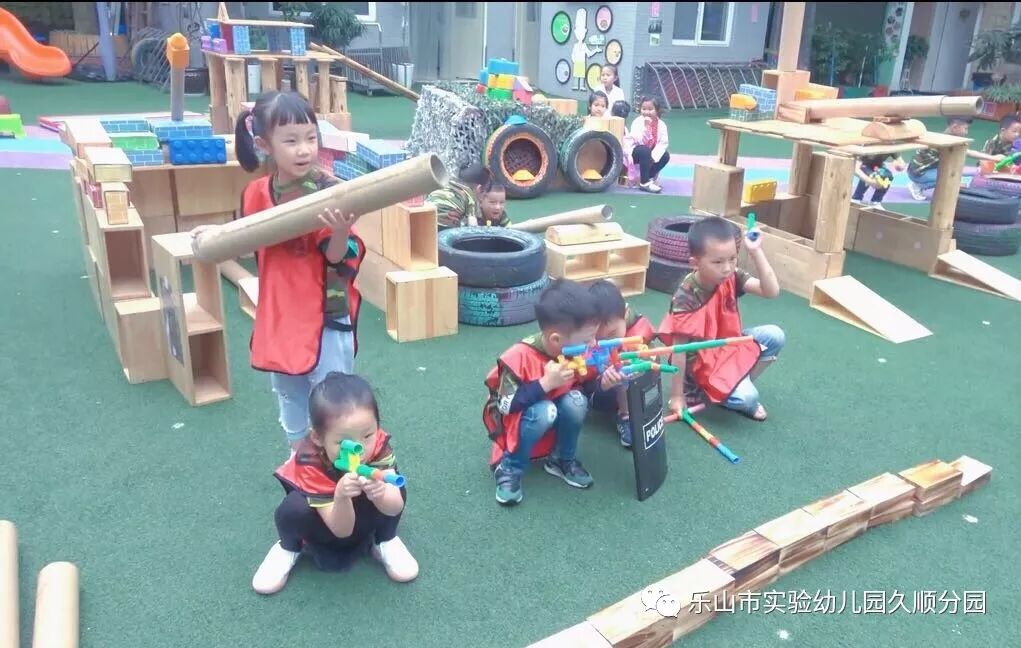 去掉成品的装备,提供能够激发幼儿制造装备的低结构材料:如管状积木、雪花片、玉米粒。。。。。。。以及各种搭建的材料,鼓励幼儿搭建出心中的军事基地,扮演心中崇拜的角色。