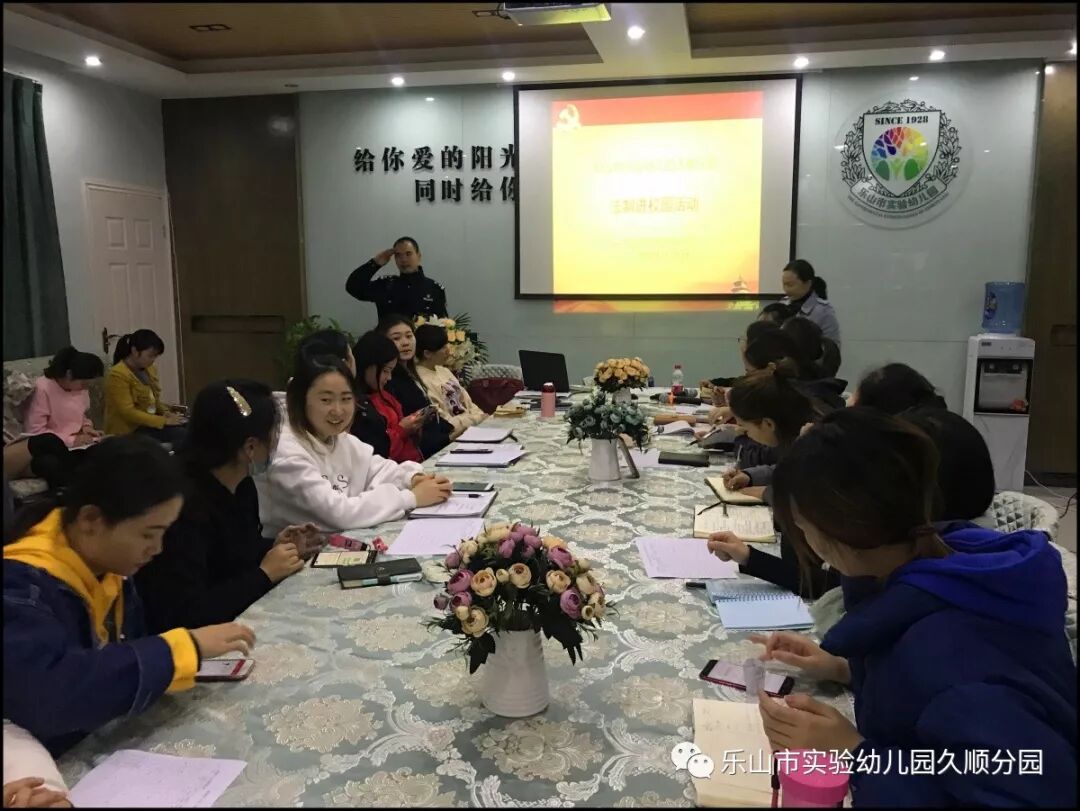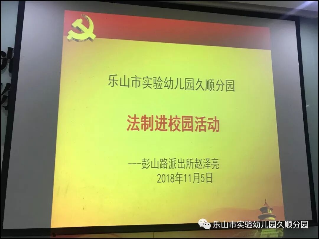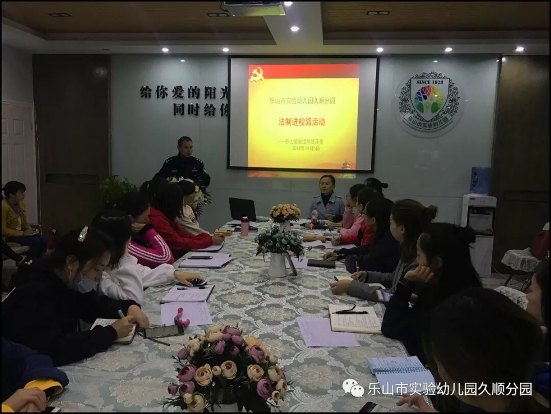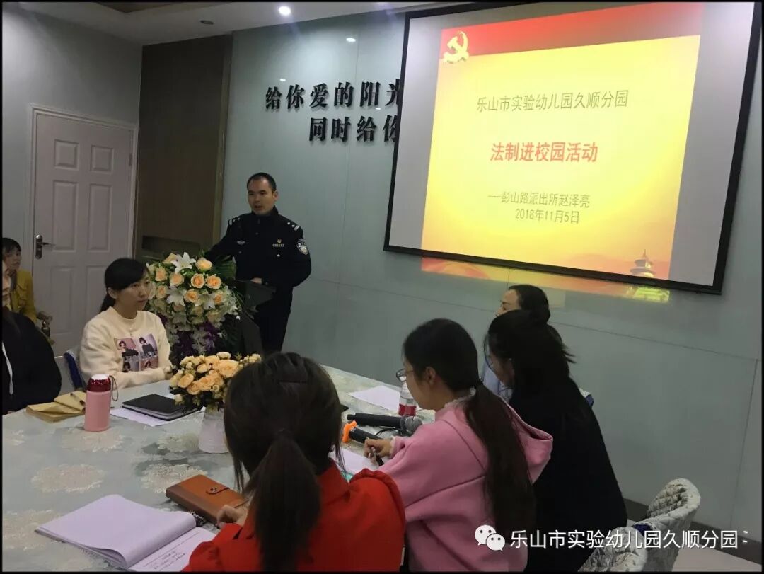 11月5日,乐山市实验幼儿园久顺分园开展了《法制进校园》宣传活动,特别邀请彭山路派出所的赵泽亮警官到园授课。赵警官就校园安全和相关法律向全体教师进行了生动的讲解,他用一些真实案例向老师们分析学法、懂法、守法的重要性,提升了老师们的法制观念。