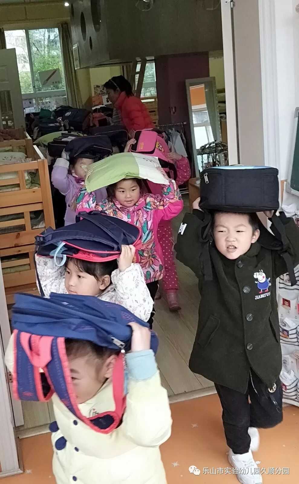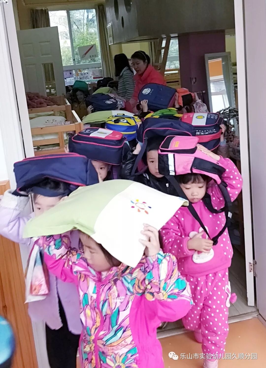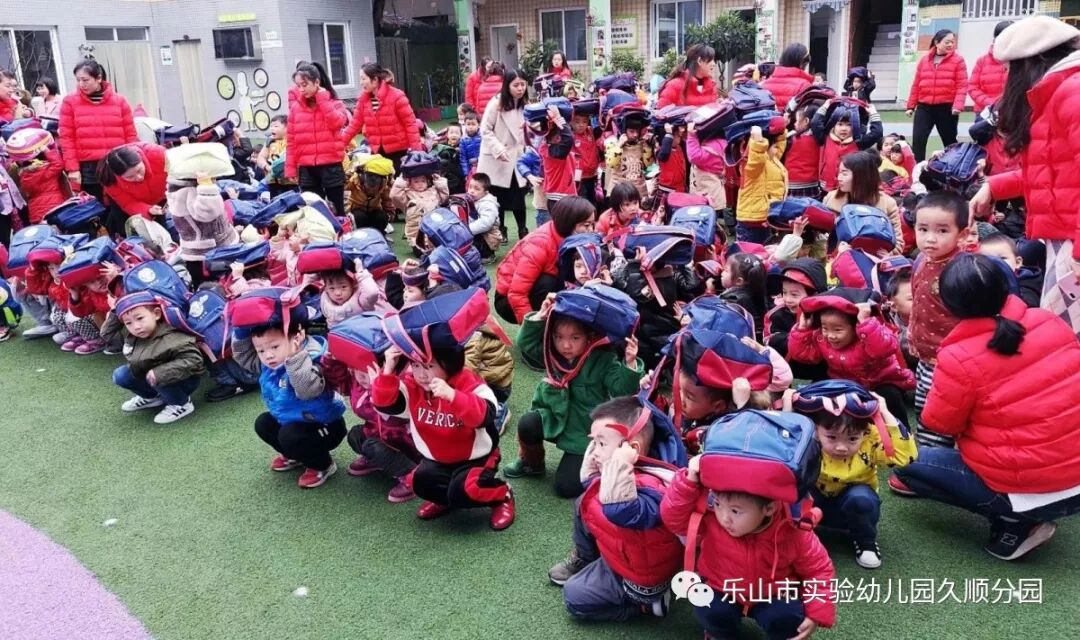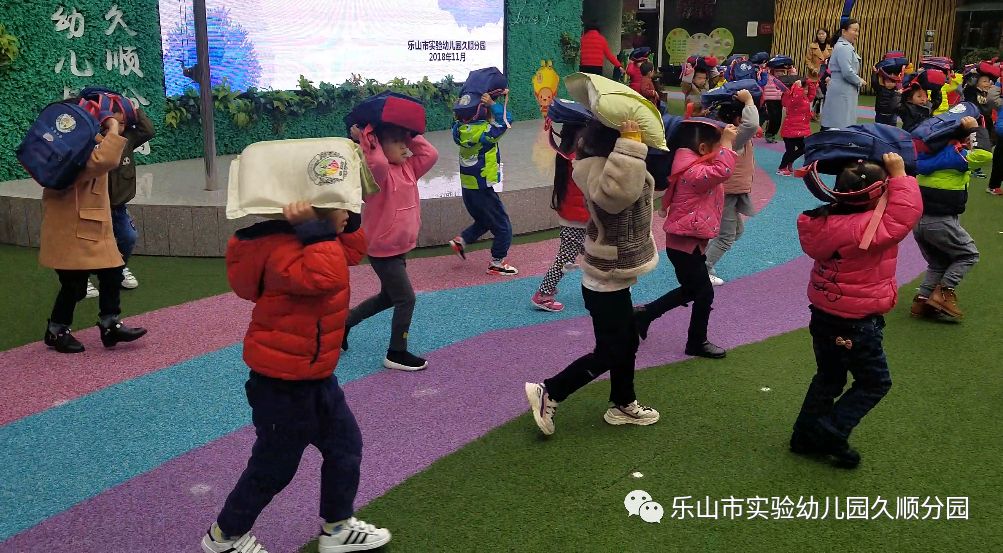 今日我园各班级和往常一样,正在有序进行班级一日活动,我园突然响起了地震逃生信号,各班级教师根据警报声马上做出判断,并立刻采取行动,指挥班级幼儿迅速拿住书包,枕头等物保护头部,井然有序撤离教室,迅速疏散到指定的“安全地带”幼儿园操场。