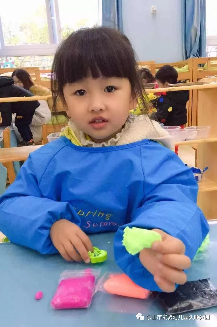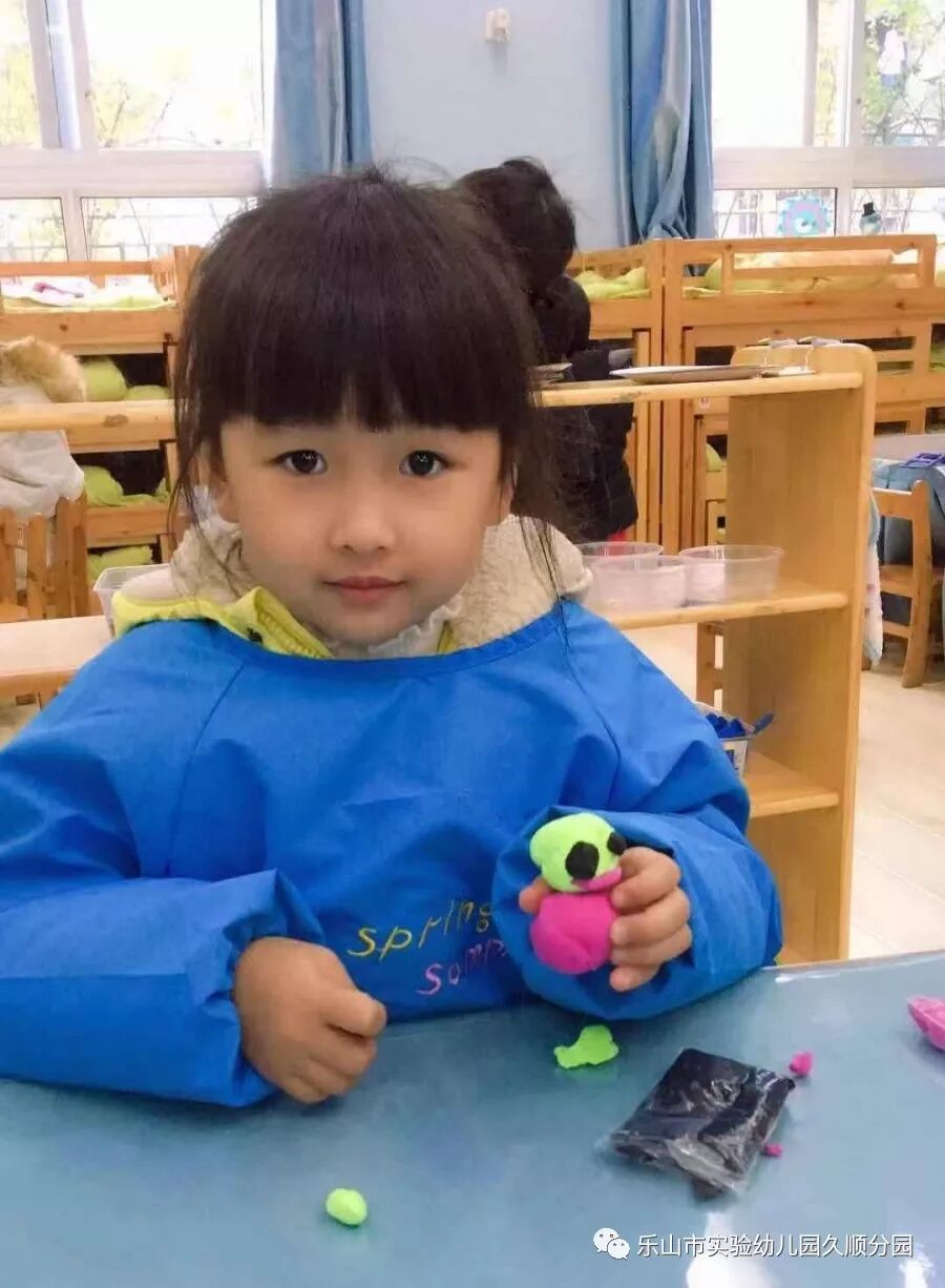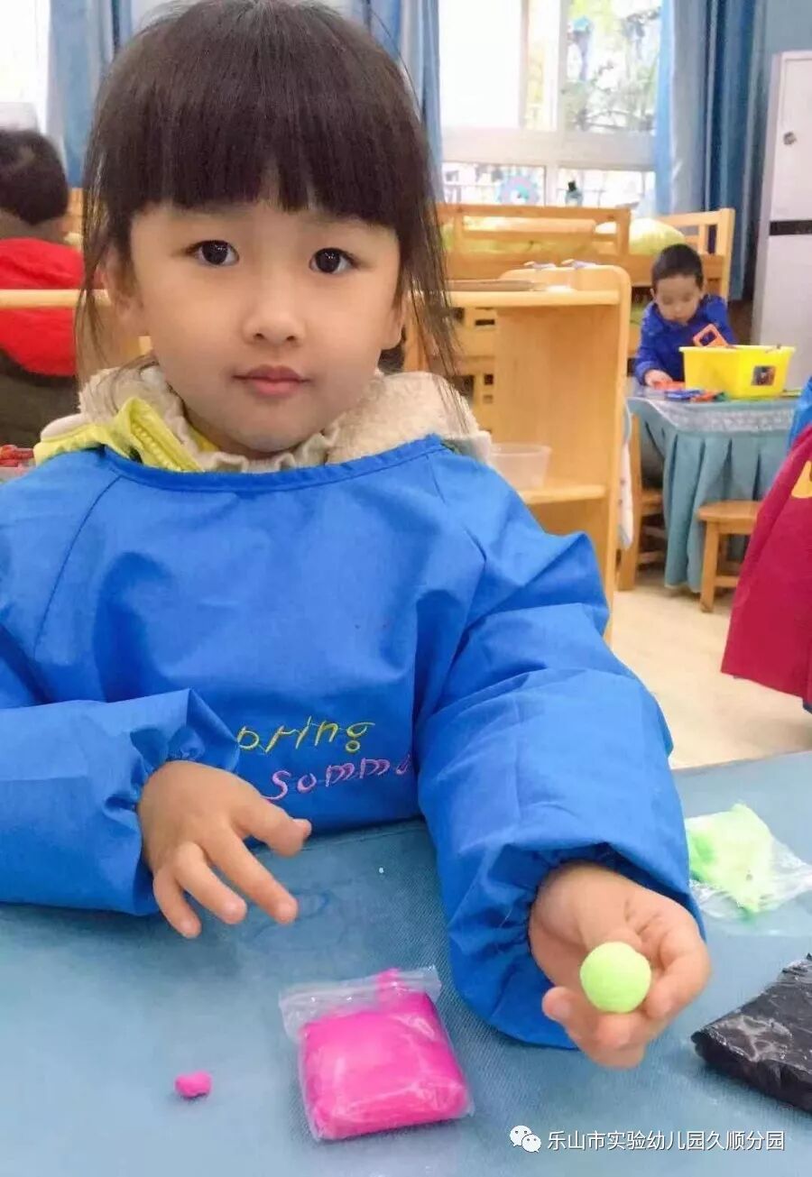 区域活动时间,艺术区,翕妹用彩泥正在做着什么,等翕妹做好了对着老师说:老师,你看,这个像不像一个雪人?