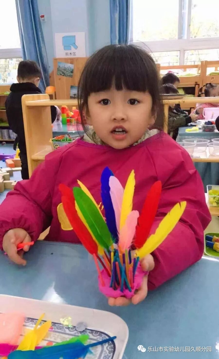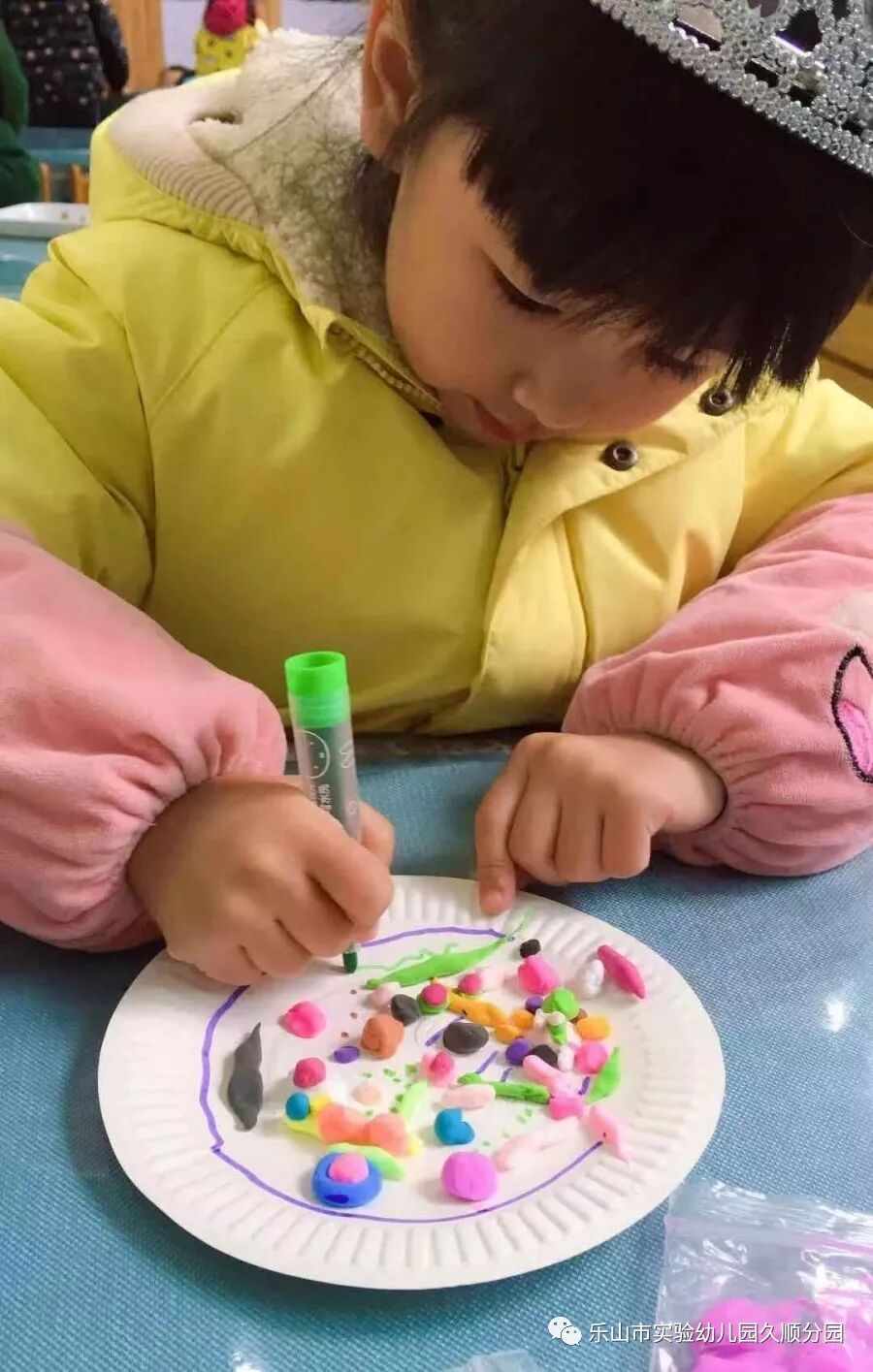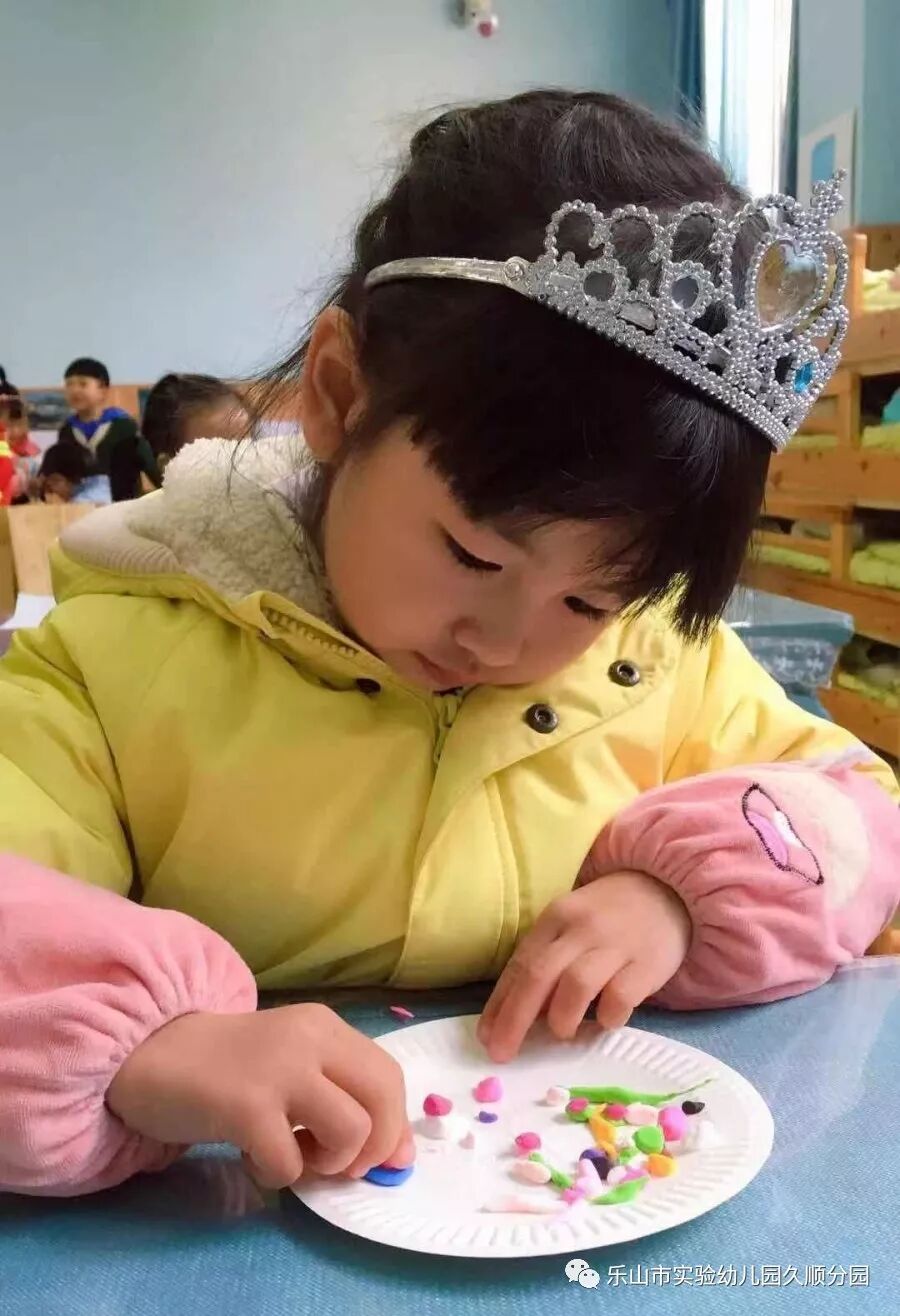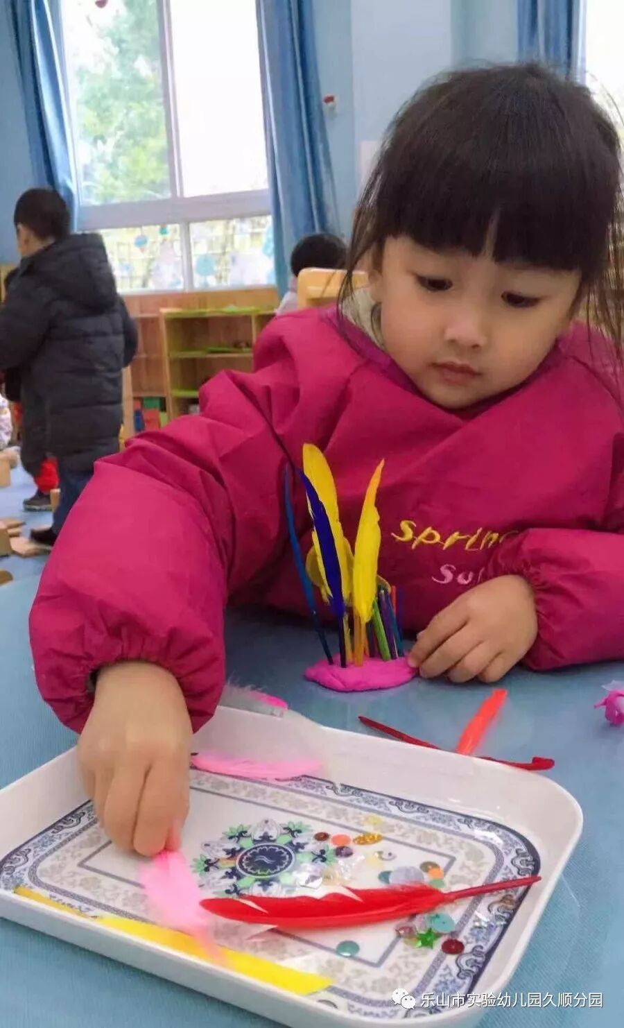 区域活动时间,艺术区,翕妹说:我要去艺术区做一个生日蛋糕,需要彩泥、羽毛、木棍 ,做好了请你吃。
