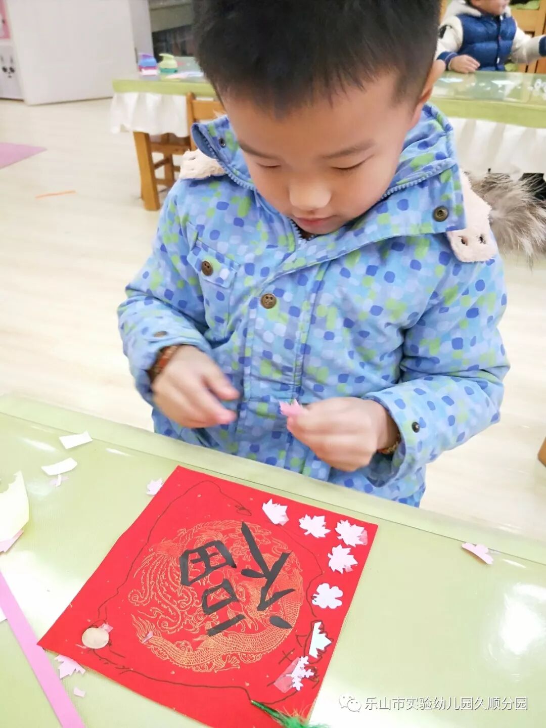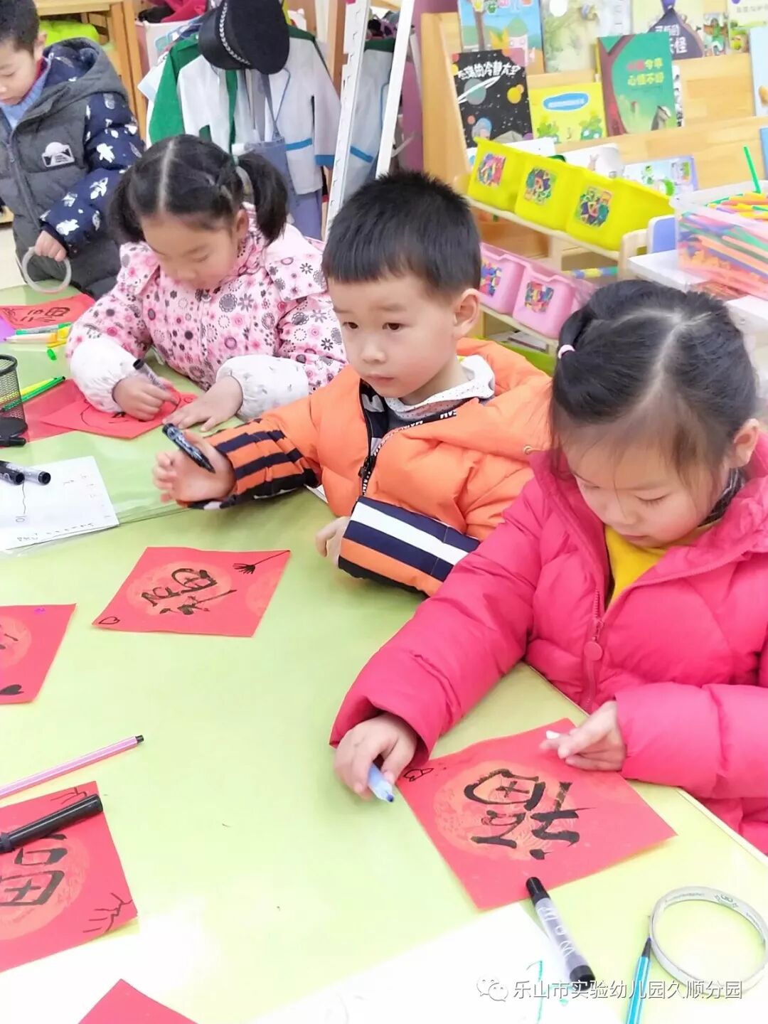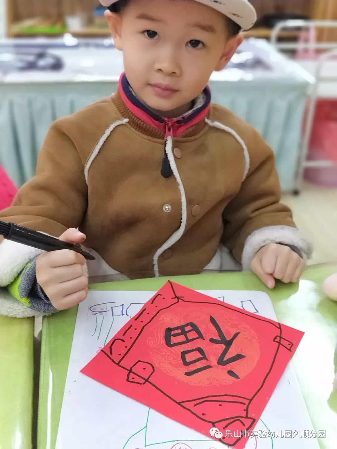 几位妈妈老师的字写得真漂亮呢!孩子们也想要动脑动手起来啦!写好的福卡,就交给我们小小设计师来设计装饰福卡吧!福卡工作室的小小设计师你们大显身手的时候到咯。