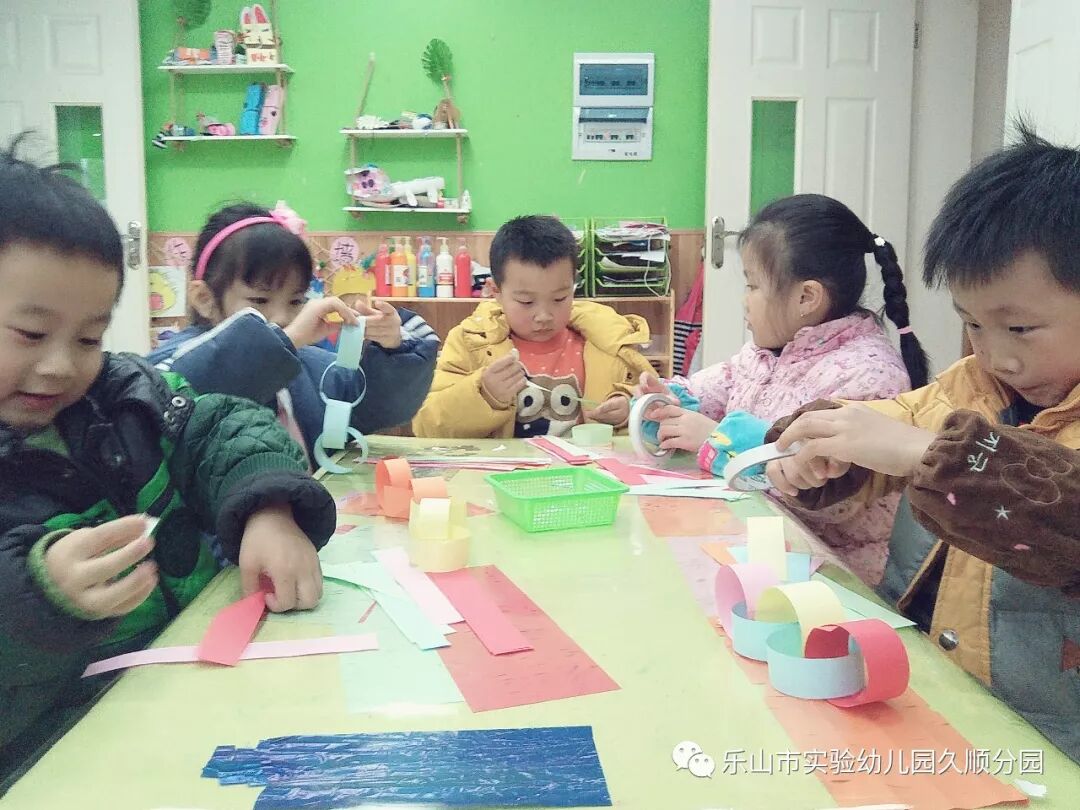 这是圆形拉花,长方形纸条短的两边黏在一起变成圆形,再用另一张纸条穿过圆形之后黏在一起,一直反复做圆形,看,彩色的圆形拉花越来越长啦