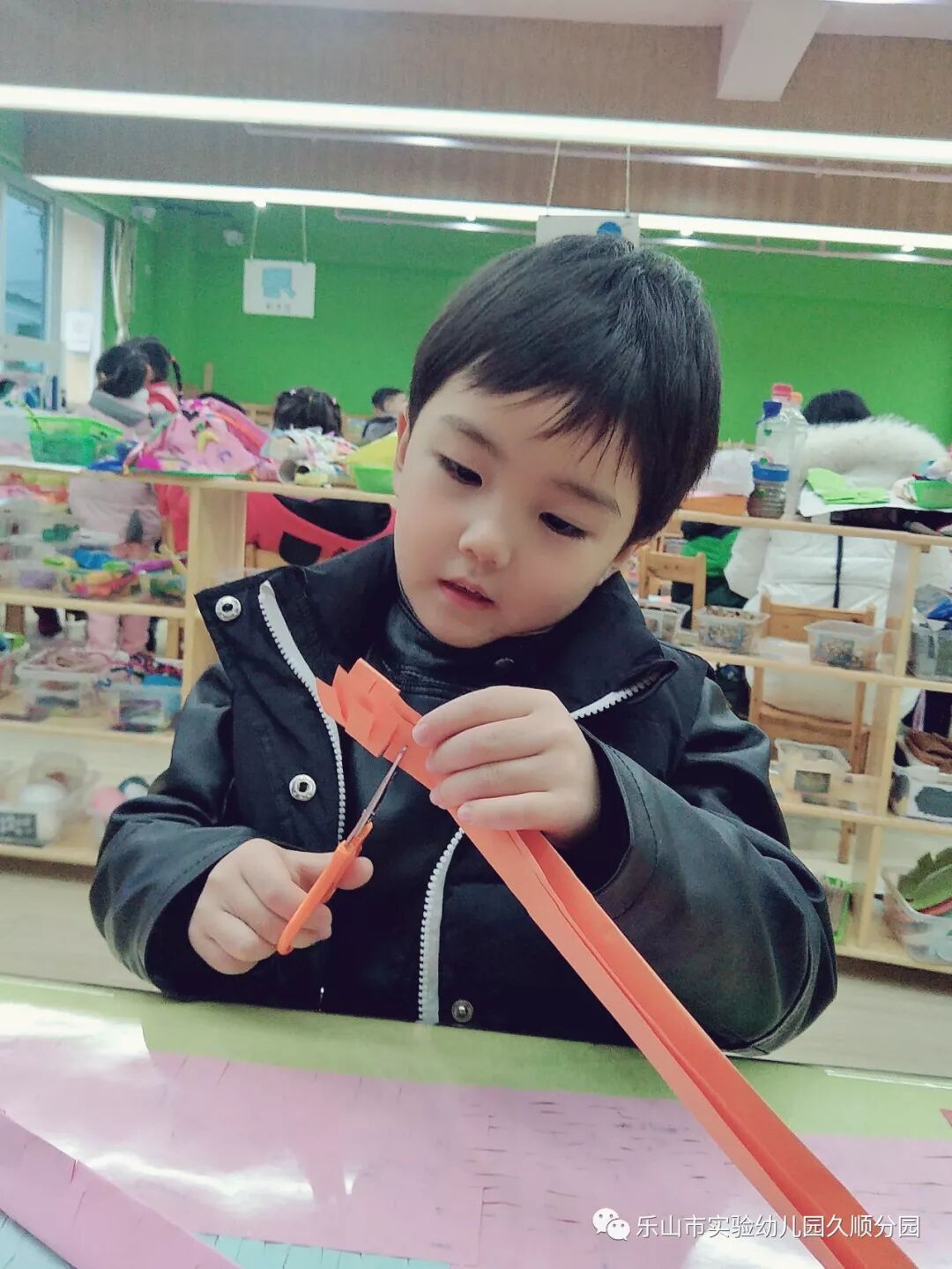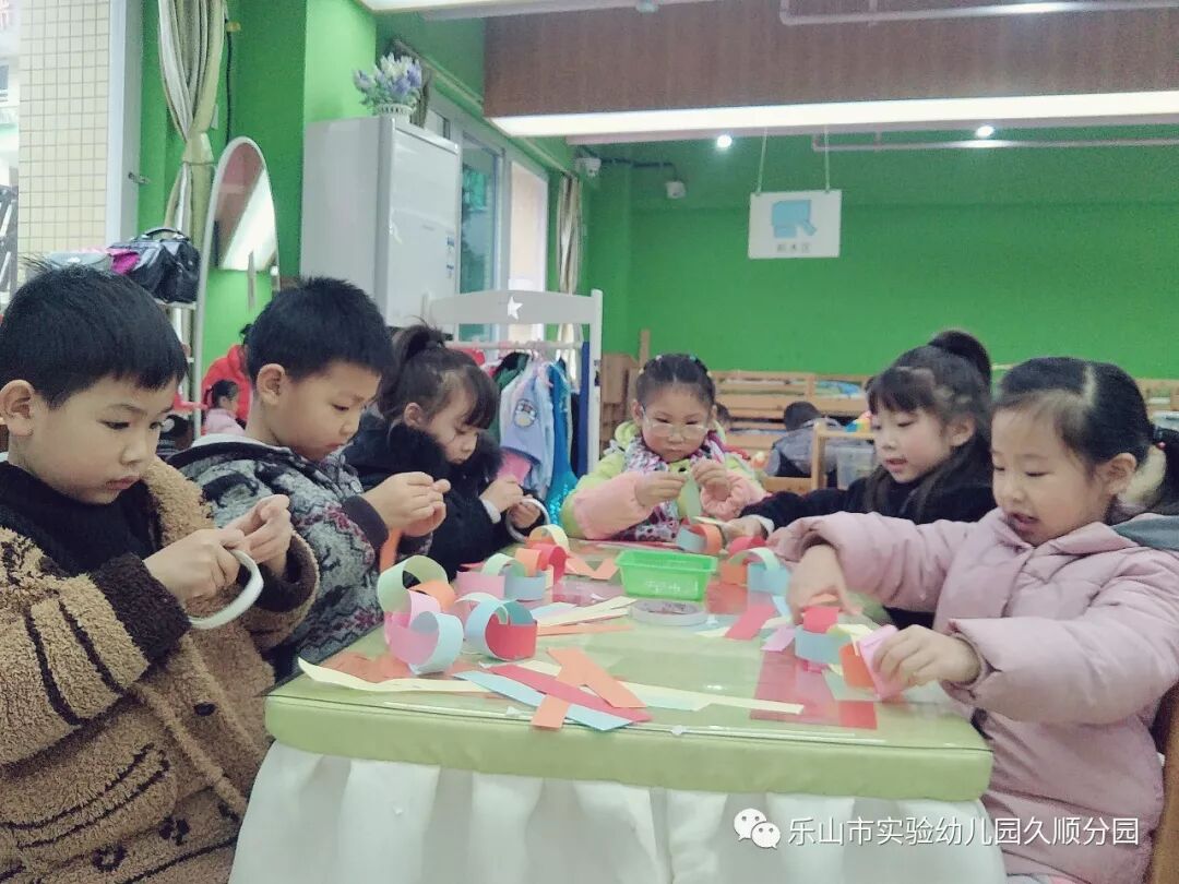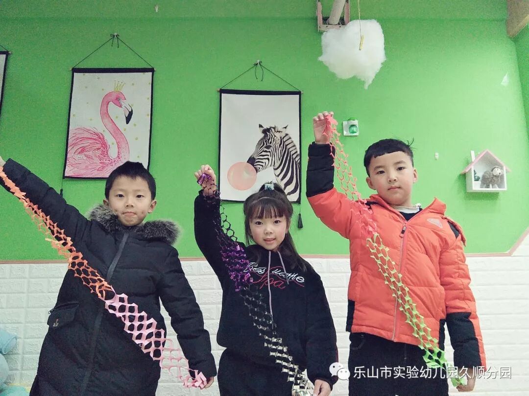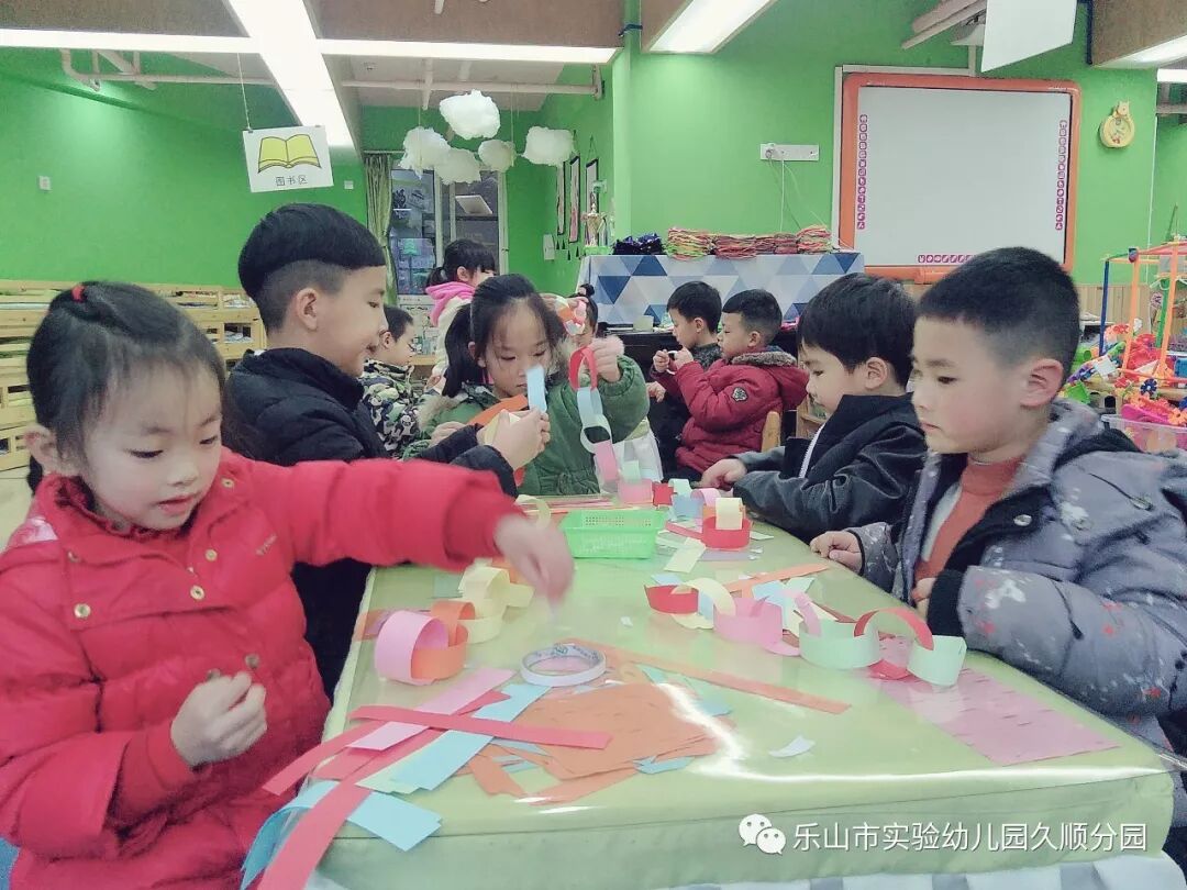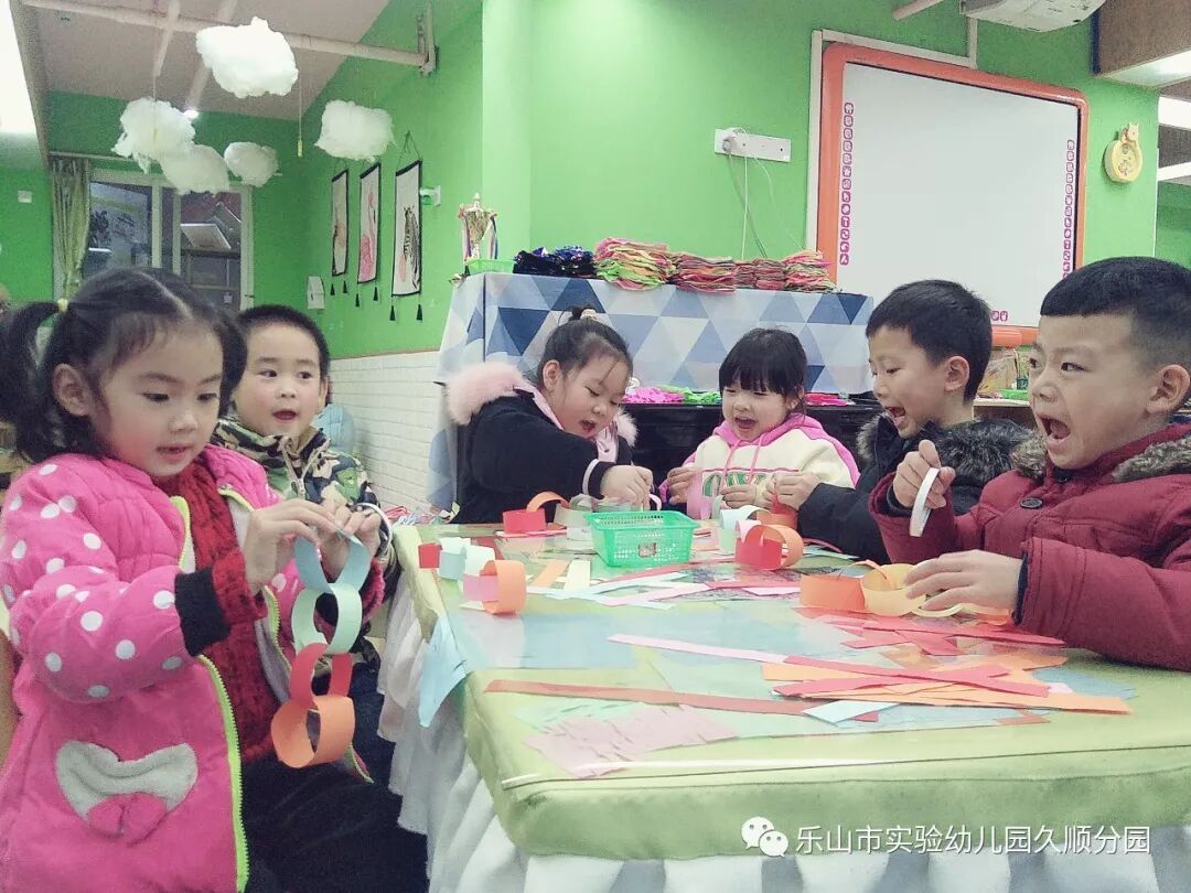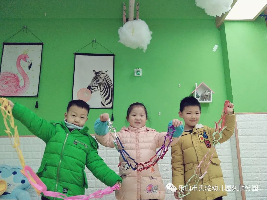 瞧,孩子们用彩纸、皱纹纸、油光纸亲自细心地剪纸条,用双面胶、订书机将纸条连在一起,做成了各式各样漂亮的拉花
