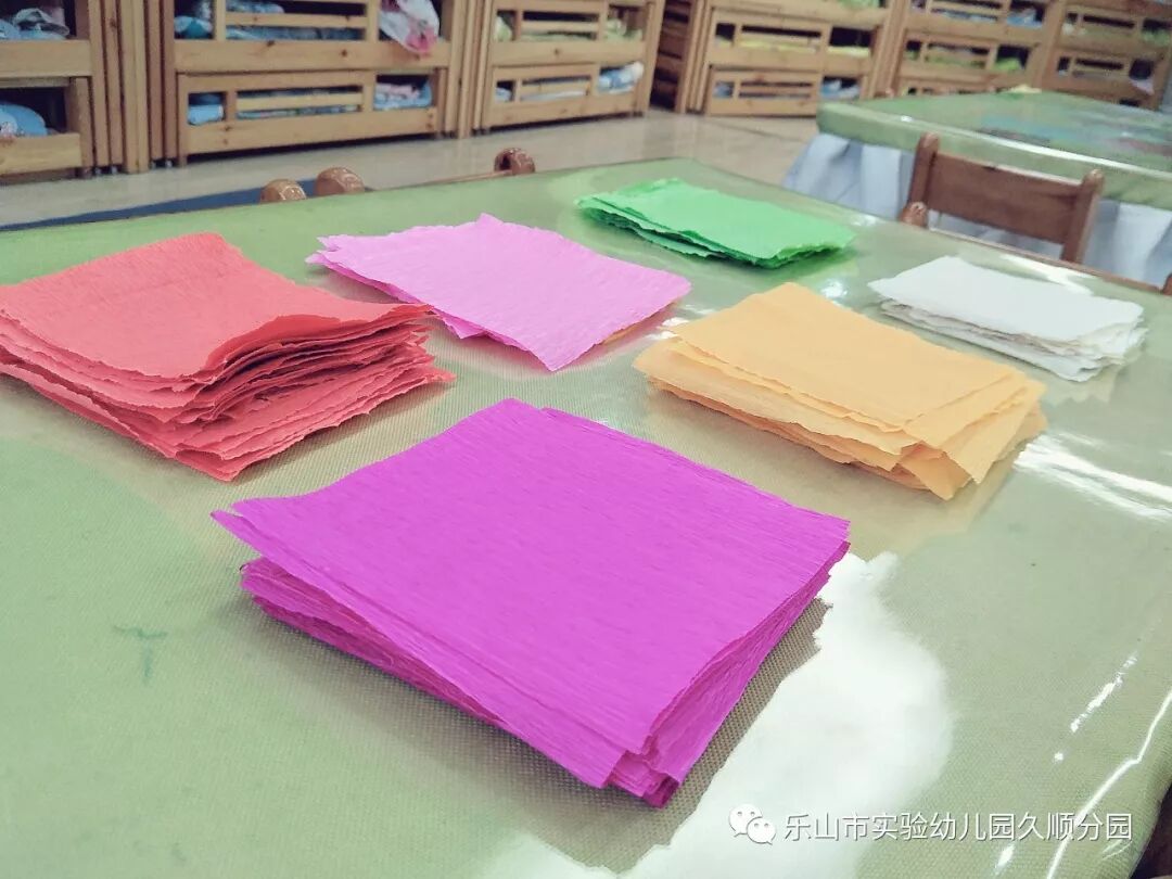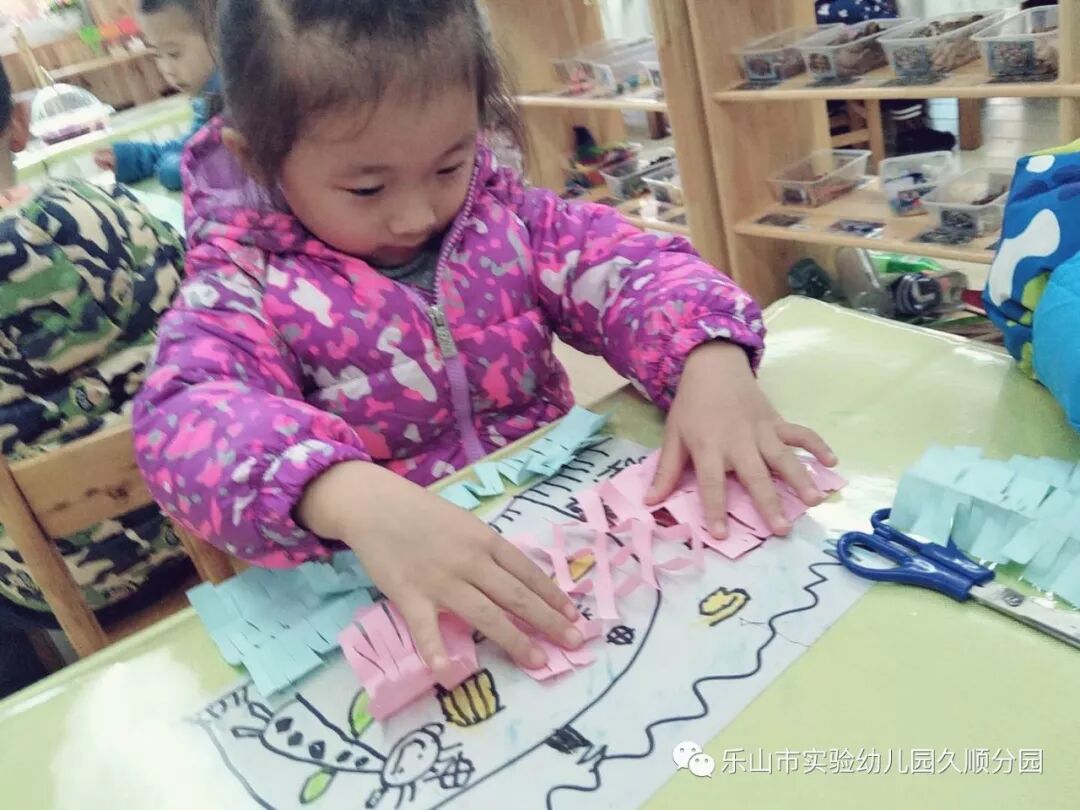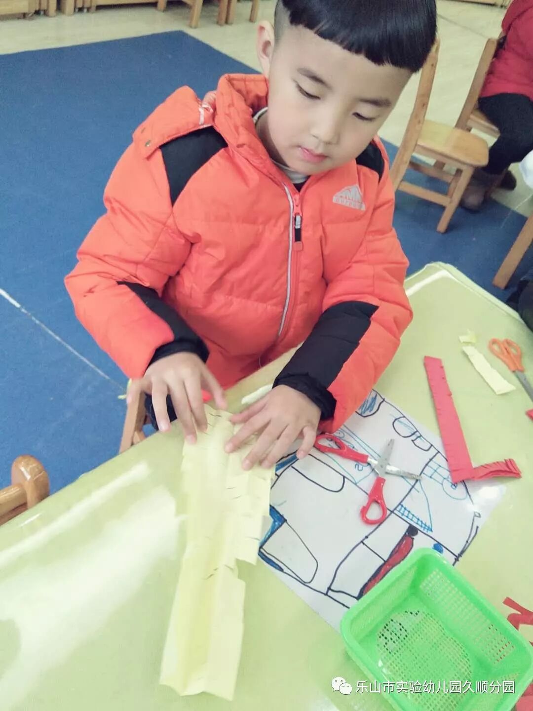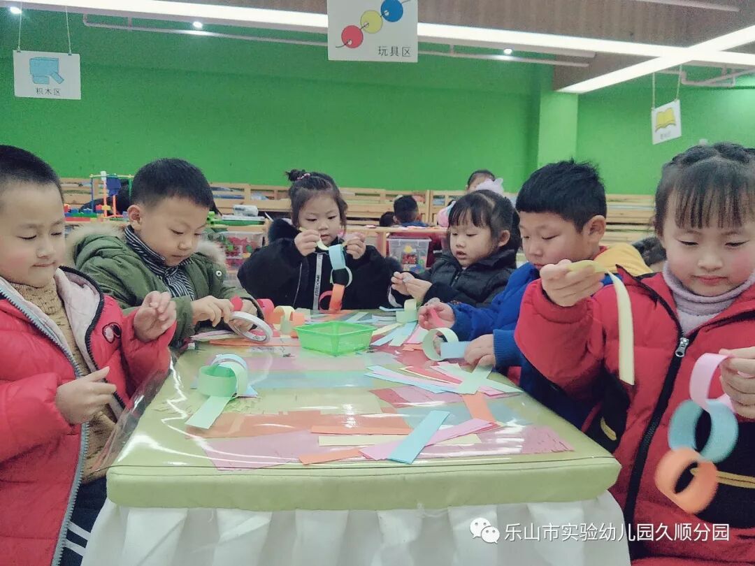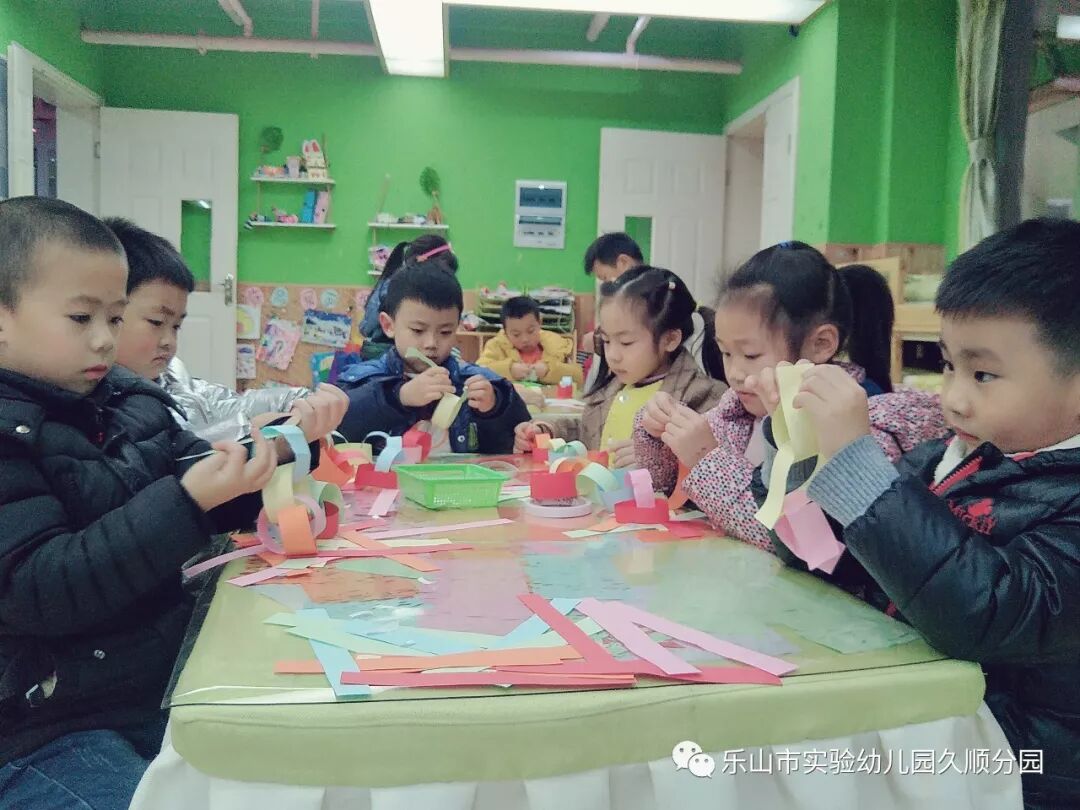瞧,孩子们用彩纸、皱纹纸、油光纸亲自细心地剪纸条,用双面胶、订书机将纸条连在一起,做成了各式各样漂亮的拉花